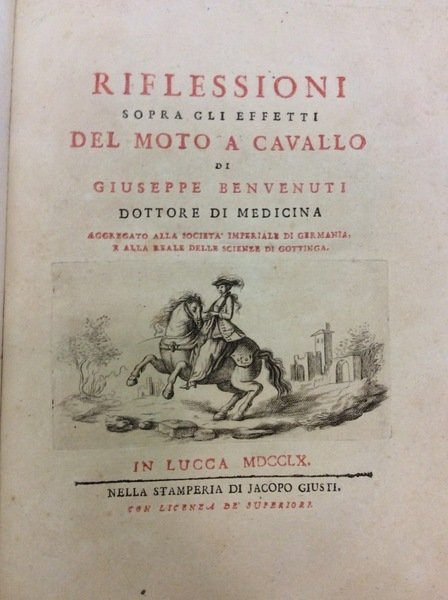 In-8 gr. (mm. 255x180), cartoncino rustico coevo (con aloni, dorso e risg. rifatti), pp. 112, frontespizio in rosso e nero con vignetta inc. in rame raffigurante un uomo a cavallo; ornato da una testata alle armi della Contessa Amalia Mniszech (Marescialla della Corte di Polonia) cui è dedicata l'opera, e da una grande e bella iniziale figurata, pure inc. su rame. "Edizione originale" di questo studio sugli effetti benefici dell'equitazione per la salute umana. Giuseppe Benvenuti (1723-1810) per circa 30 anni esercitò la professione di medico nei celebri Bagni di Lucca. In queste riflessioni' attinge largamente agli scritti di Sydenham, Baglivi, Boerhaave, ecc., dissertando degli effetti dell'equitazione sulla circolazione sanguigna, dell'elasticità delle fibre muscolari e dei vasi arteriosi e linfatici. L'equitazione è raccomandata per la sua azione di stimolo sull'attività degli spiriti animali', sulla funzione epatica, la digestione, la circolazione linfatica e - quasi panacea universale - come rimedio contro l'arteriosclerosi, l'idropisia, l'apoplessia, l'isteria e varie altre malattie. Lo scritto si conclude con una serie di consigli sulla pratica di questo sport e con varie norme di igiene. Così Diz. Biografico Italiani, VIII, p. 675.Cfr. anche Wellcome,II, p. 145 - Blake, p. 41.Solo lievi tracce d'uso altrimenti esemplare marginoso, ben conservato.