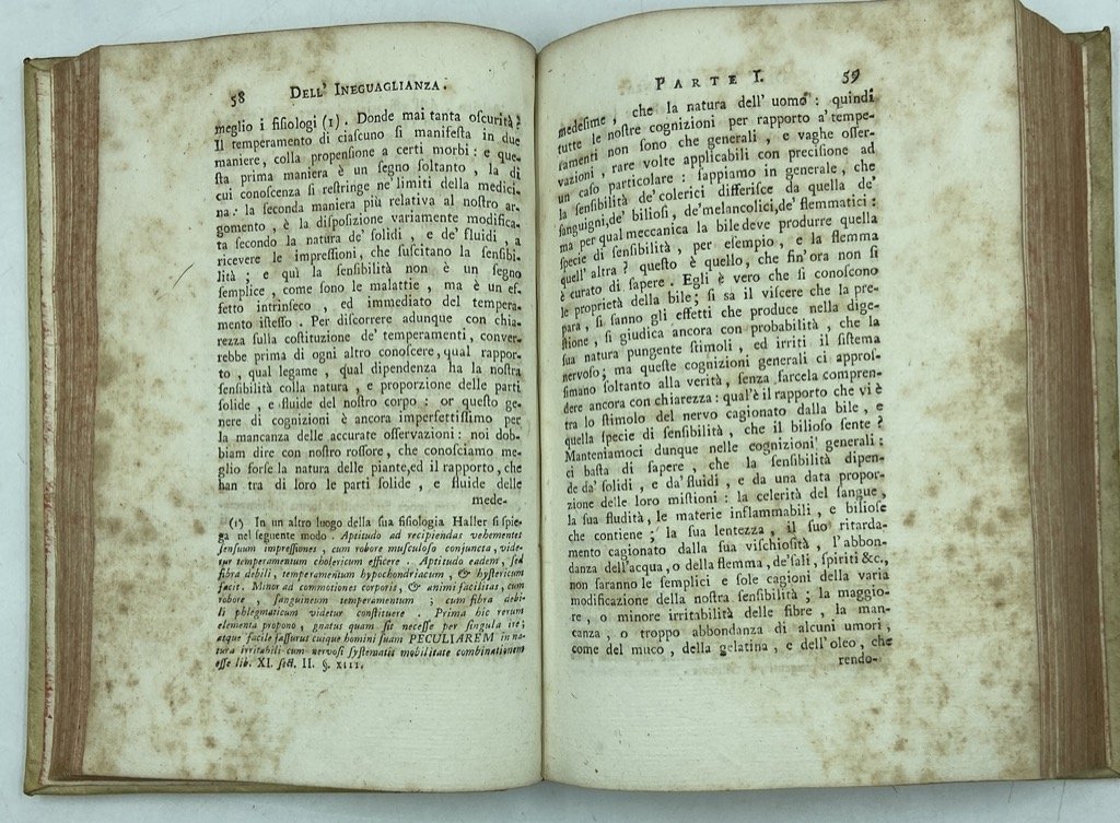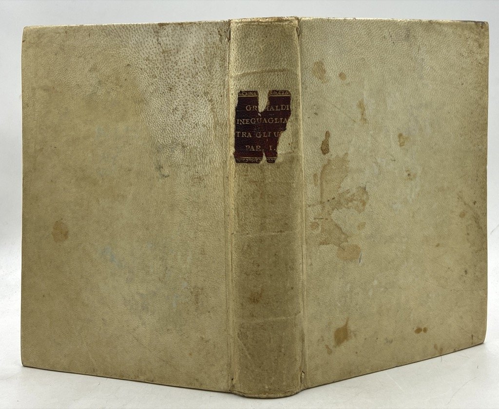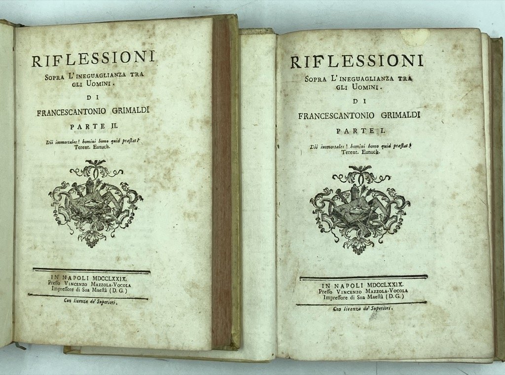 Due volumi (su tre) in piena pergamena rigida con nervi passanti alle cuffie e frammenti di tasselli in pelle con titoli sul dorso, in ottavo, cm 20 x 14, (8) XIX (I) 384, 267 (1). Buono stato di conservazione, mancanze sui tasselli, ordinari arrossamenti delle carte. Privo della terza parte. Francescantonio Grimaldi, nato a Seminara in Calabria da una famiglia di nobiltà genovese, si avviò agli studi forensi a Napoli, ove entrò in contatto con gli allievi di Antonio Genovesi ed esercitò brevemente l’avvocatura prima di trasferirsi a Genova per dedicarsi alla ricerca filosofica. Illuminista conservatore, Grimaldi pose al centro di più d'uno dei suoi lavori il tema dell'aristocrazia come classe che, riformata, avrebbe dovuto guidare la riforma della società - il giurista rifiutava infatti la democrazia come la forma di governo «più prossima alla tirannide». Il pensiero dell'autore maturò pienamente in queste Riflessioni sopra l'ineguaglianza degli uomini, opera che richiamandosi al realismo di Machiavelli e all'empirismo di Hume, e in netta polemica con Rousseau e l'illuminismo radicale, intendeva studiare gli uomini non «quali essi potrebbon o dovrebbono essere, ma quali per fatto sono», utilizzando gli strumenti delle scienze naturali, della statistica, dell'etnologia. L'appartenenza dell'essere umano ad una società, e ad una società gerarchizzata, è per l'autore un fatto innegabile, riscontrabile in ogni tempo e luogo: è la condizione naturale dell'umanità e non la corruzione di un ipotetico stato di natura. Richiamandosi al monogenismo di Buffon, Girmaldi spiega le differenze dell'umanità con le molteplici influenze che l'ambiente esercita sul suo sviluppo. La diseguaglianza fisica (tra individui come tra «razze») è connessa a quella morale e allo sviluppo dei diversi stadi di civiltà. A sostegno delle proprie tesi Grimaldi, «lettore onnivoro e appassionato della letteratura di viaggi, nel primo libro delle Riflessioni accumulò descrizioni documentatissime delle differenze tra popolazioni di diverse parti del mondo, soffermandosi sugli effetti del clima, sui diversi bisogni e sui diversi modi di soddisfarli (dalla dieta ai costumi sessuali), sulle malattie e le cure.» (Perna, DBI). L'opera, nonostante la mole e una certa farraginosità, ebbe notevole riscontro presso i contemporanei, soprattutto in Germania. L'esemplare qui proposto comprende purtroppo soltanto le due parti dell'opera pubblicate nel 1779, che trattano dell'ineguaglianza fisica e di quella morale, ed è privo della terza, apparsa l'anno seguente, dedicata all'ineguaglianza politica.