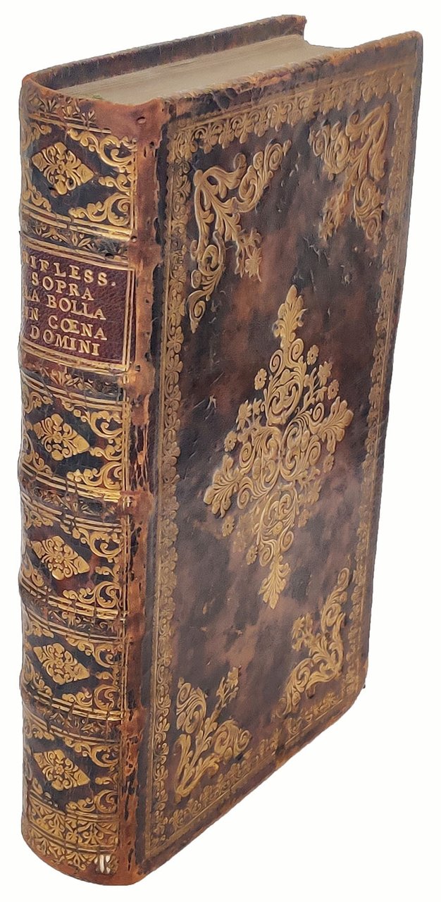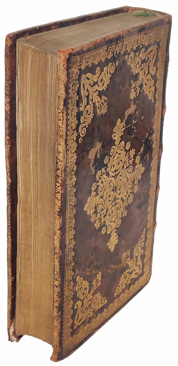 In 8vo (mm. 198x114). Pp. [4], 340, [4]. Segnatura: [π²] A-V8 X¹². Bella antiporta xilografica allegorica (un gruppo di cavalieri che scacciano alcuni frati, mentre su un piedestallo la figura femminile della Verità scaccia le tenebre con la sua luce). Vignetta xilografica al frontespizio, filetto tipografico, testatina e iniziale xilografica a inizio opera. Rilegato in vitello marmorizzato dell'epoca con fregi ornamentali impressi in oro ai piatti e al dorso, titolo in oro al dorso su tassello in marocchino, tagli dorati, controguardia su carta marmorizzata blu, segnalibro in raso verde (rilegatura lievemente consunta, specialmente alle cerniere, lungo i bordi e agl'angoli, piccoli tarli al dorso, controguardia lievemente staccata dal piatto). Bell'esemplare.