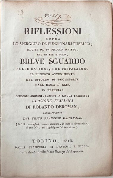 Riflessioni sopra lo spergiuro de' funzionarj pubblici; seguite da un piccolo scritto , che ha per titolo, Breve sguardo sulle cagioni, che prepararono il funesto avvenimento del ritorno di Buonaparte dall'isola d'Elba in Francia: opuscoli anonimi [.].