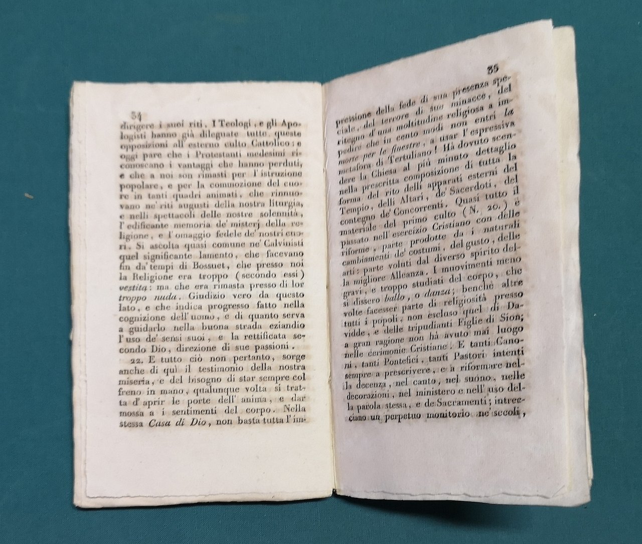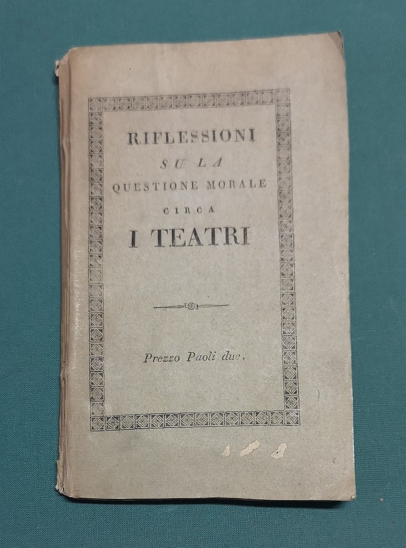 >in-16, pp.129, (3), broch. edit. a stampa. Arguto libello anonimo, che sostiene che la tesi del ''Teatro moderno assolutamente illecito'' non possa essere sostenuta né in logica, né teologicamente, né dai Padri della Chiesa, né dalle Scritture. La sua pubblicazione suscitò una risposta polemica del sacerdote Bartolommeo Guidetti stampata a Roma nello stesso 1821. A pieni margini. Non in Melzi né in altre bibliografie consultate. Un esempl. in ICCU, 37257.