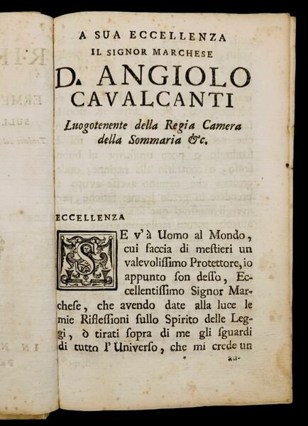 In 8° grande (19x11,8 cm); (20), 7-359, (1 b.), XV, (1 b.) pp. Legatura coeva in piena pergamena rigida con titolo impresso in oro al dorso (piccola mancanza al margine basso del dorso). All'interno, qualche piccola fioritura e macchiolina di foxing dovute alla qualità della carta napoletana utilizzata per la stampa e nel complesso esemplare in buone condizioni di conservazione. Fregio xilografico al frontespizio. Iniziale xilografica. Prima edizione di questo commento all'opera di Montesquieu del noto giurista pugliese, Ermenegildo Personè appartenente alla nobile famiglia Lecce dei Personè (proprietari di Palazzo Personè a Lecce). L'opera presenta una dedicatoria ad Angiolo Cavalcanti, luogotenente della R. Camera della Sommaria, datata Napoli 6 ott. 1766 (assente in alcuni esemplari), come ad esempio l'esemplare di riferimento dell'ICCU che appunto non presenta la dedicatoria. Personè, giurista molto apprezzato ed influente nel panorama culturale conservatore pugliese del settecento, fu un fiero oppositore delle idee illuministe. Pubblicò questo trattato per criticare fortemente le idee espresse da Montesquieu nello Spirito delle Leggi sostenendo che tali teorie sovversive possono essere fomentatrici di disordini. Prima edizione, nella versione più completa. Rif. Bibl.: IT\ICCU\SBLE\014176.