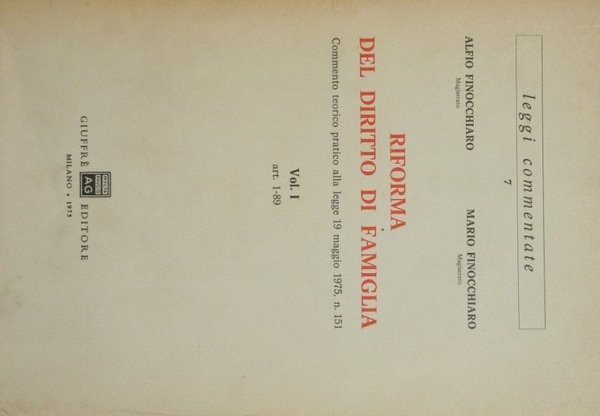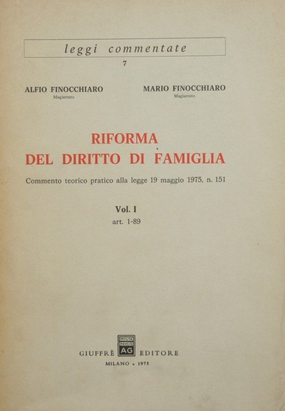 Commento teorico pratico alla legge 19 maggio 1975, n. 151 - Collana Leggi commentate. Nn. 7-8 - in 8° - pp.IV + 662; IV + 431 - Brossura editoriale - Due volumi - Molti fogli chiusi - Vol. I: Art. 1-89; Vol. II - Tomo I: Art. 90-130