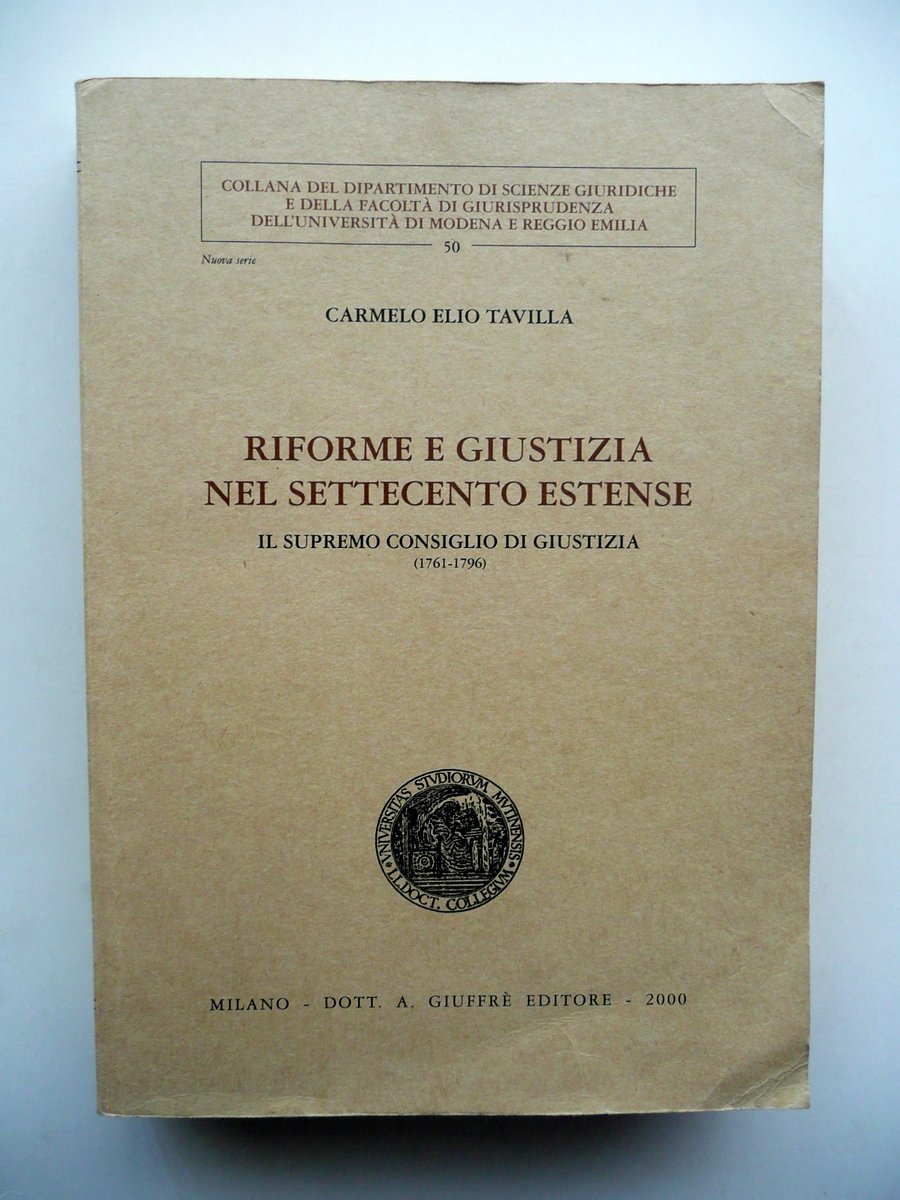 Carmelo Elio Tavilla, Riforme e Giustizia nel Settecento Estense Il Supremo Consiglio di Giustizia (1761 - 1796) A. Giuffrè Editore, Milano 2000, cm 24x17, pp. VIII; 566; brossura ed. Prima bianca con dedica autografa e firmata dall'Autore. Condizioni di conservazione Esemplare in buone condizioni con tracce d'uso; brossura ant. e dorso leggermente ingialliti; margine inf. della brossura ant. e tre angoli delle brossure con minime tracce di pieghette. Interni buoni; margine inf. delle pp. V-VI (indice) con un minimo strappetto; angolo inf. della prima bianca e del frontespizio con un circoscritto lieve accenno d'ingiallimento. Prima bianca con dedica autografa e firmata dall'Autore. SETT99.L9384 N