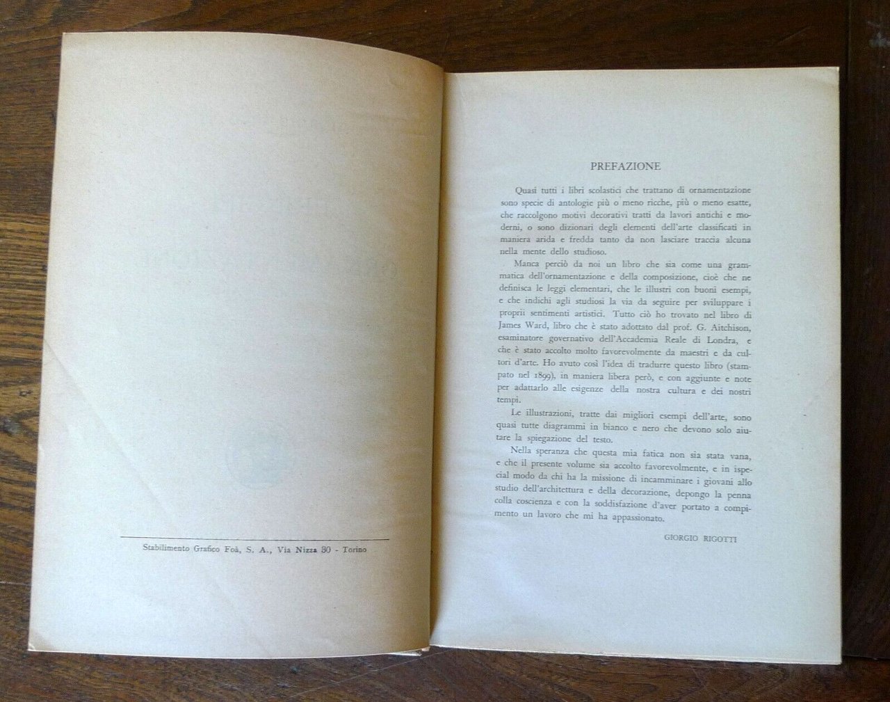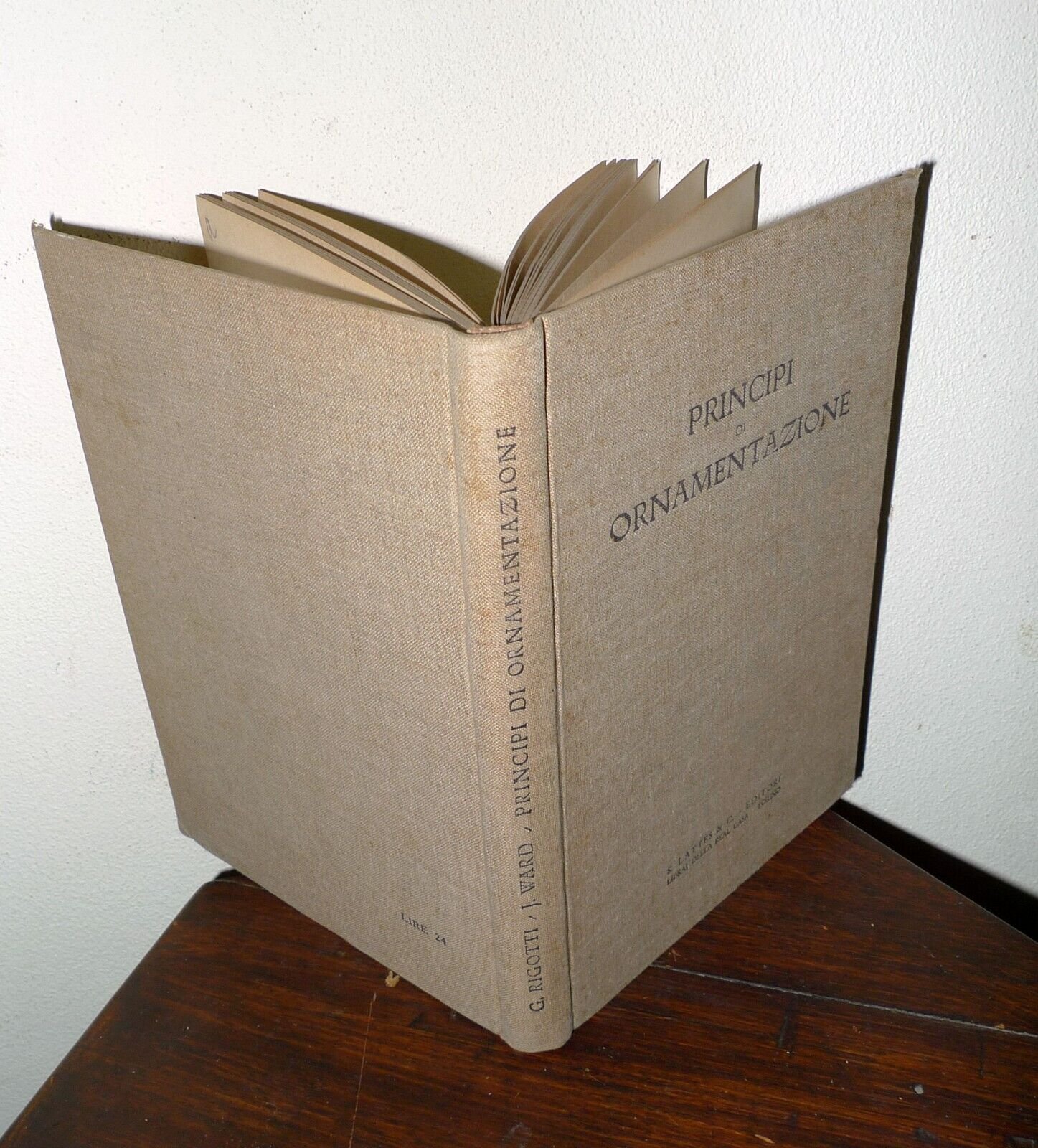 Giorgio Rigotti,PRINCIPI DI ORNAMENTAZIONEDI JAMES WARD.TRADUZIONE LIBERA CON AGGIUNTE E NOTE.S. LATTES & C. EDITORI LIBRAI DELLA REAL CASA,TORINO, senza data (primo '900),copertina rigida, rilegatura coeva in tela,22x15 cm., pp.XV-204,numerose illustrazioni,peso: g.500