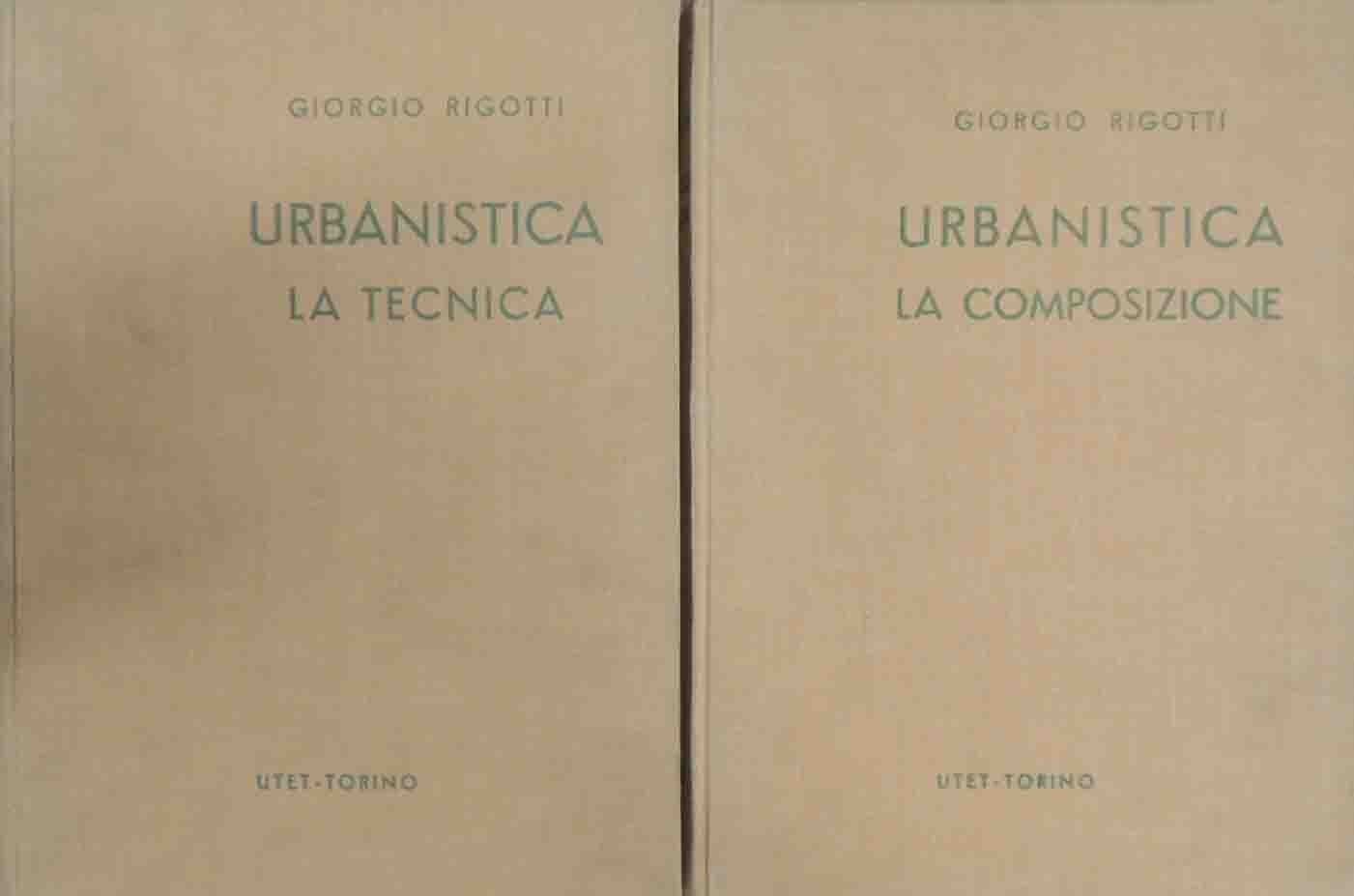 Giorgio Rigotti, Urbanistica, Unione Tipografico-Editrice Torinese, s.l. (ma stampato a Torino, presso la Tipografia Sociale Torinese) 1952-1956, 2 voll., pp. XXV, 1472, ill. b.n., cm 27, tela ed. con titoli al dorso e al piatto. Volume I: La tecnica, 1956, seconda ed. riveduta e aggiornata, pp. XVI, 854. Volume II: La composizione, 1952, pp. IX, 618. Leggere tracce d’uso alle legature, fioriture, lieve ingiallitura della carta, per il resto buoni.