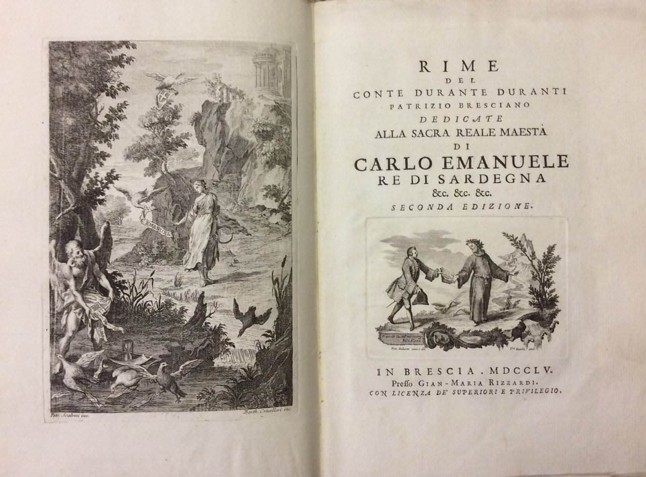 In-8 gr. (mm. 273x196), cartonato rustico coevo (alone al piatto), pp. (2),VIII,(2),CCXXXIV, illustrato da: antiporta allegorica, vignetta al frontesp., ritratto di Carlo Emanuele III inc. da Marco Pitteri, testata alle armi del Re di Sardegna (cui è dedicata l'opera), ritratto del Conte Durante Duranti, 8 testate e 8 finali, 120 bellissime grandi iniziali figur. a vignetta, tutte inc. in rame. Questa elegante edizione è composta da 8 epistole in versi e da 111 sonetti.Così è descritta dal Morazzoni (p. 174): "Piccolo capolavoro di gusto veneziano.. sontuoso per una serie deliziosa di capricciose testate e finali a soggetto realistico ambientato in un paesaggio fantastico, ideata da Pietro Scabrini con gusto assai bizzarro. Il bel libro è inciso da Bartolomeo Crivellari e da Francesco Zucchi e di notevole ha pure la ricca serie di lettere iniziali a sfondo architettonico" - Cfr. anche Gamba,2223. Solo ultime due carte con piccoli fori di tarlo, altrimenti esemplare con barbe, ben conservato.
