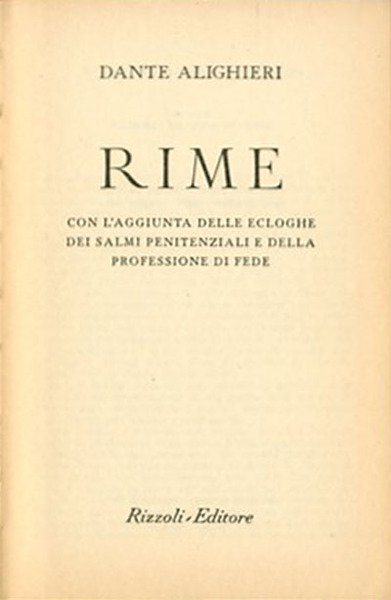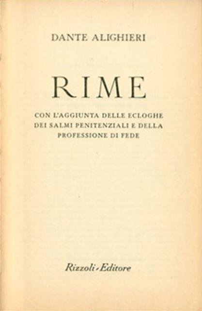 182 p. ; 16 x 11 cm. Biblioteca universale Rizzoli. Sono una raccolta di componimenti poetici composti da Dante in un ampio arco di tempo, dalla giovinezza sino ai primi anni dell'esilio, non inclusi da lui nella "Vita nuova" o nel "Convivio": non si tratta pertanto di un'opera progettata coscientemente dall'autore, ma di testi sparsi che gli studiosi moderni hanno organizzato in un'edizione secondo criteri compositivi e soprattutto cronologici (benché la datazione di molte di queste liriche sia incerta). Si tratta di 54 componimenti di sicura attribuzione dantesca (34 sonetti, 13 canzoni, 5 ballate e 2 sestine), cui vanno aggiunti 26 testi di dubbia attribuzione e altri 26 testi di «corrispondenti» poetici, tra cui Guido Cavalcanti, Cecco Angiolieri, Cino da Pistoia. Vari sono i modelli cui si rifà l'autore, dai siculo-toscani delle rime giovanili (specialmente Guittone d'Arezzo, poi rifiutato), agli stilnovisti (tra cui spicca l'amico Cavalcanti), ai provenzali del trobar clus (Arnaud Daniel), ai poeti comico-realisti. Notevole è la varietà dei temi, anche se prevale una ricerca della sperimentazione, metrica e linguistica, ed è centrale il tema amoroso, non solo nelle rime riconducibili allo Stilnovo ma anche nei testi che si ispirano ad altre scuole poetiche. In base alla cronologia e ai temi trattati le poesie vengono solitamente suddivise in cinque gruppi: rime giovanili e stilnovistiche, tenzone con Forese Donati, rime «petrose», canzoni dottrinali e allegoriche, rime dell'esilio. Note di Gustavo Rodolfo Ceriello. Legatura editoriale, coperta rigida in similpelle di colore verde con impresso il titolo in oro al dorso, muto il piatto. Codice libreria 1657.