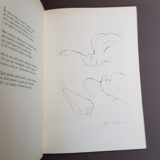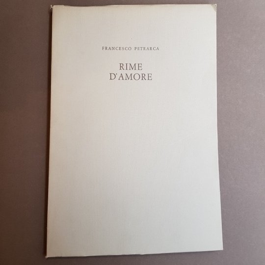 In-folio, pp. 107 (5), con 2 punte secche stampate con torchio a mano su tavole fuori testo di Paola Marchiori. Brossura editoriale. Dal colophon:' questo volume, in edizione fuori commercio, composto a mano coi caratteri Garaldus della Nebiolo di Torino ed illustrato con disegni originali, è stato stampato nel mese di Dicembre MCMLXIV in duecentocinquanta copie numerate in macchina'. Esemplare n. 61 ad personam.