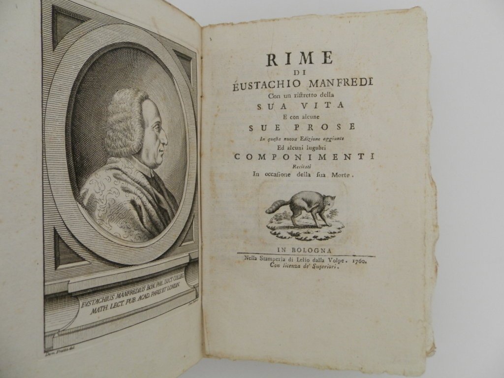 8^, pp. IV, 235, (1), con ritratto calcografico in antiporta di Giovanni Fabbri, su disegno di Domenico Maria Fratta, legatura d'attesa in cartonato rustico, esemplare con barbe, marca dell'editore incisa al frontespizio. Eustachio Manfredi (Bologna, 1674-1739) fu lettore di matematiche nella locale università e dal 1704 direttore del collegio di Montalto. Scrisse di astronomia, geometria e idrostatica, ma fu pure valente scrittore in versi. Ottima copia.. *** TUTTI I NOSTRI LIBRI SONO VISIBILI PREVIO CONTATTO MAIL O TELEFONO NELLA NUOVA SEDE DI MILANO: LIBRERIA COSMOPOLIS, VIA JOMMELLI, 22. ***
