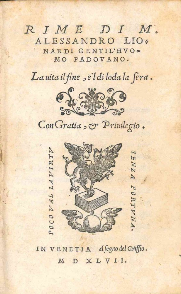 Prima edizione.Esemplare molto buono (ultima carta leggermente rifilata, con restauro all’angolo interno inferiore con perdita di poche lettere. Mancanza all’angolo inferiore destro di c. 64, senza perdite), complessivamente fresco.Opera prima, e la più importante, del nobile padovano Alessandro Lionardi: accoglie quasi 300 componimenti, la maggior parte sonetti, per quanto non manchino le canzoni, le sestine, le ballate e i madrigali. Programmatico il sonetto di apertura, che prende le distanze dalla poesia epica – «Scriva e canti chi vol d’arme e di guerra» – per rivolgersi alla tematica amorosa, cantando non una, ma due donne insieme: «Ch’i’ bramo di lodar duo gentil nodi, / che sì altamente m’annodar già ‘l cuore [.] L’un con bellezze e si leggiadri modi; et l’altro con virtù, con tal valore, / che d’honorarli mai non sarà stanco». Lionardi pubblicò una seconda parte delle «Rime» nel 1550 e fu autore di un importante trattato di versificazione e retorica, i «Dialogi della invenzione poetica, et insieme di quanto alla istoria et all’arte oratoria sìappartiene, et del modo di finger la favola», stampato per Plinio Pietra Santa a Venezia nel 1554.Cfr. Graesse, IV, 219