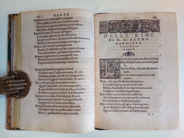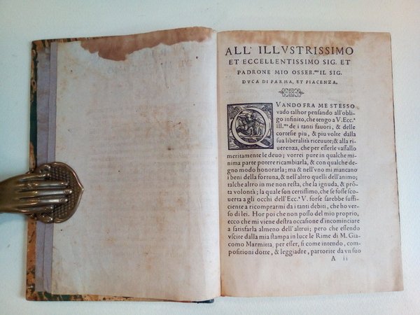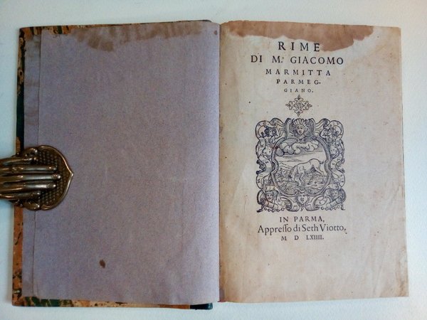 Cm. 20 x 14; cc. 4, pp. 198, cc. 6 di errata e indici con bel fregio tipografico al frontispizio, testatine e capolettera ornati; bella legatura posteriore in mezza pelle con titoli e fregi dorati al dorso, piatti marmorizzati, tagli colorati, segnalibro in seta.<BR>CONDIZIONI BUONE: alone di umido al margine superiore delle prime 2 carte; piccolo restauro professionale all'angolo inferiore della prima pagina; alcune pagine con piccolissime fioriture; margine superiore un po' stretto.<BR>Ex libris e talloncino di bilbioteca privata.