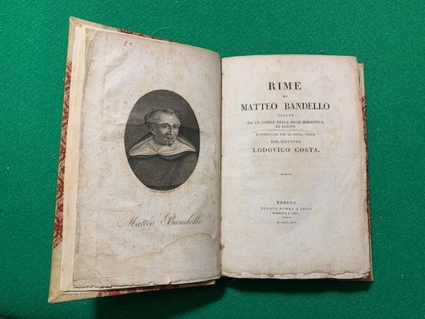 In 4°; XXIII, (1), 273, (15) pp. e 2 c. di tav. una con ritratto di Bandello e una con riproduzione di una pagina dell'antico codice manoscritto da Bandello dal quale il testo è stato tratto. Legatura realizzata intorno al 1920 in mezza-pergamena con titolo e autore impressi in oro al dorso su fascetta in pelle. Qualche leggerissima fioritura dovuta alla qualità della carta in tre pagine, un leggerissimo alone al margine basso del ritratto, ininfluente. Un piccolo timbretto antico di dazi doganali, probabilmente del Lombardo-Veneto al recto dello stesso, solo in parte leggibile e per il resto in buone-ottime condizioni di conservazione ed ancora in barbe. Prima edizione di questa raccolta di rime del celebre scrittore e vescovo, Matteo Bandello (Castelnuovo Scrivia in provincia di Alessandria, 1485 - Bazens, 1561). Non comune.