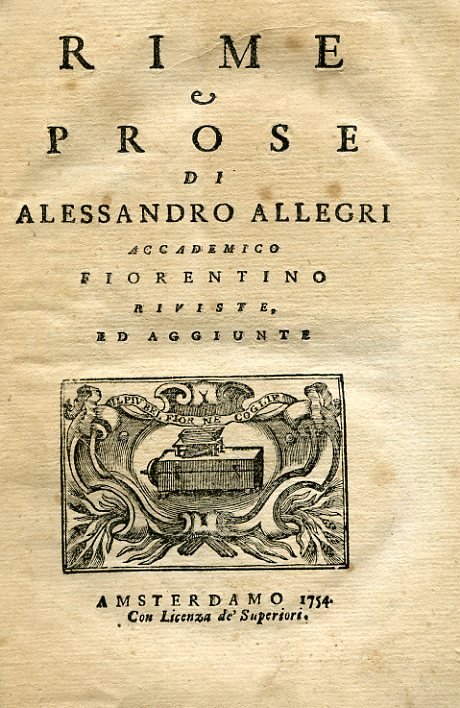 In-8° (200x30mm); pp. VIII, 264, brossura originale marmorizzata. Frontespizio con xilografia con il frullone emblema della Crusca. Iniziali istoriate. Sul contropiatto, etichetta di libreria antiquaria e antica firma di appartenenza. Bruniture diffuse dovute alla qualità della carta ma, nel complesso, bell'esemplare. Seconda edizione (stampata a Lucca con luogo fittizio di Amsterdam) di questa raccolta di rime e prose di Alessandro Allegri (Firenze, 1560 ca.-ivi, 1629), stampata per la prima volta a Verona nel 1605. Divisa in quattro parti, che furono pubblicate anche separatamente, la raccolta contiene numerose canzoni e testi in prosa, tutti dedicati ad illustri personaggi dell'epoca e di intonazione prevalentemente burlesca. L'Allegri, segretario di nobili personaggi, ecclesiastico e letterato ('scolare, cortigian, soldato e prete' amava definirsi), fu il fondatore, con una cerchia di amici volti alla goliardia, dell'Accademia della Borra. Gamba, 28. Graesse, I, p. 80. Brunet, I, col. 189. Gay, n. 1023. Cat. Vinciana, 2872. Per la biografia dell'autore, D. M. Manni, 'Notizia di A. A.' in 'Veglie piacevoli', Firenze, 1815, IV, 61-97; Mazzuchelli, Gli Scrittori d'Italia, I, 1, pp. 504-507; Belloni, Il Seicento, pp. 318 e sgg.