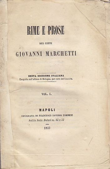 RIME E PROSE del conte Giovanni Marchetti SOLO IL VOLUME I. Tipografia di Francesco Saverio Tornese, 1857.