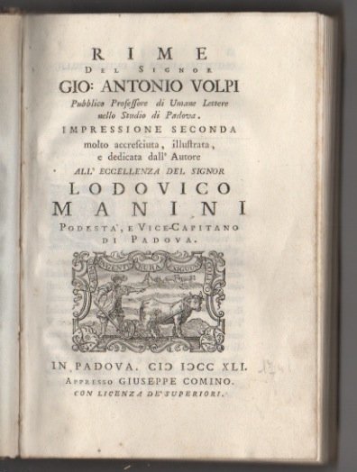LIBROSeconda edizione accresciuta.Ottimo esemplare, molto fresco e pulito.Giovanni Antonio Volpi, letterato padovano (1686-1766), «diresse una tipografia affidata alla direzione tecnica di G. Comino. I prodotti della tipografia Volpi-Cominiana sono tra i più apprezzati del Settecento italiano, sia per eleganza (esemplari tirati su pergamena e su carta azzurrina, nitidezza dei tipi, ampiezza di margini), sia per correttezza tipografica e filologica» (Enciclopedia Treccani, s.v.).