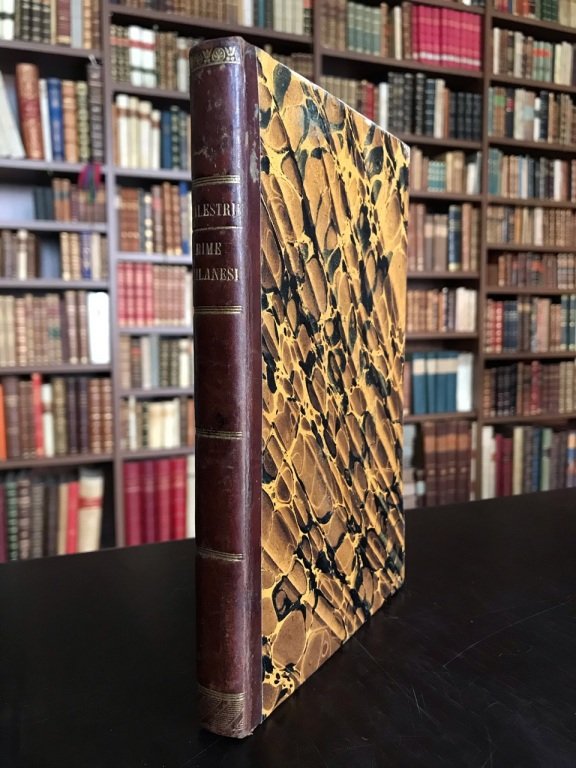 In-8° (cm. 20), legatura leggermente successiva in mezza pelle con titolo in oro al dorso e piatti marmorizzati; pp. VIII 173 [1] in ottimo stato e fresche, fregio al frontespizio, testatine e finalini; mancanza della prima e dell'ultima carta sicuramente bianche, Ex libris impresso al frontespizio e alla dedicatoria. Edizione originale delle rime inedite curata dalla figlia dell'autore Giuseppa Balestrieri Parea e dedicata al conte Durini di Monza. Cfr. Predari 372. Buon esemplare. (SC2)