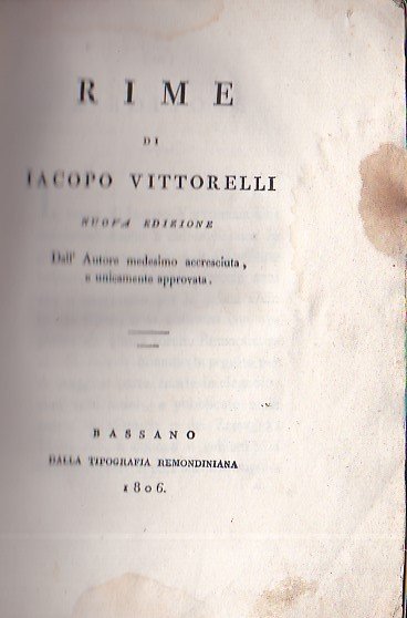 In-8°, pp. XV, 159, bella brossura originale decorata a fiorami impressi in rosso. Restauri alla brossura, sparsi aloni interni. In barbe. La melodicità delle liriche vittorelliane ebbe molta fortuna, tanto che alcune di esse, come Guarda che bianca luna o Non t'accostare all'urna, furono messe in musica, tra gli altri, da Franz Schubert, Vincenzo Bellini e Giuseppe Verdi. Gamba, 2688.