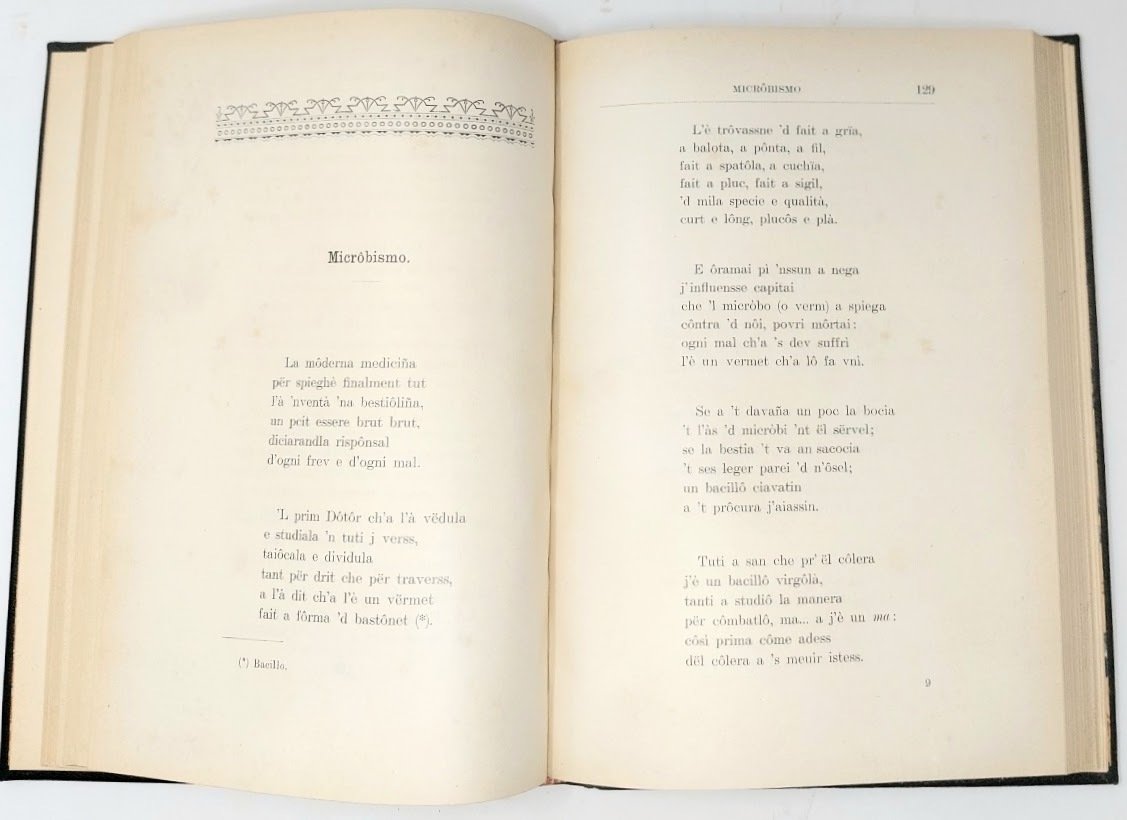 >in-8, pp. XIV, 312, leg. posteriore p. pelle, dorso ornato in oro (difetti alle cerniere). Contiene ben 132 poesie in piemontese, seguite da un'Appendice ''1893, Le feste di Gaindôja'', comprendente le poesie ''L'invit''e ''Giandôja a Rôma'' e l'operetta comica in un atto e 5 quadri in versi ''Giandôjeide''. Esempl. perfetto. Clivio n. 2606.
