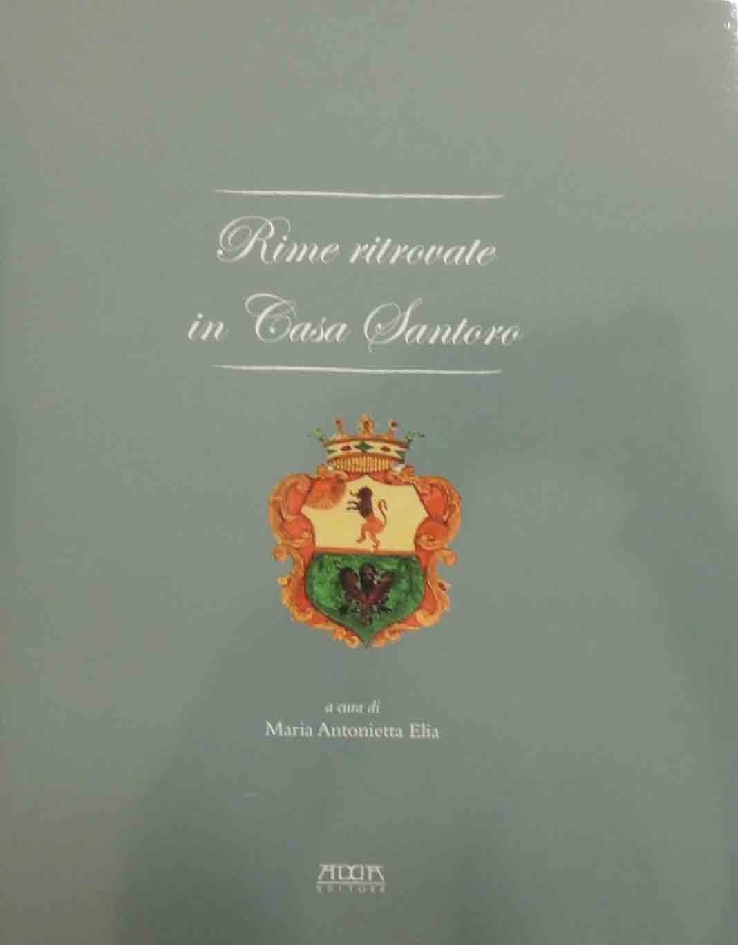 Rime ritrovate in Casa Santoro, a cura di Maria Antonietta Elia, Mario Adda Editore, Bari 2010, pp. 91, ill. col., cm 27, tela ed. con titoli al dorso, sovraccoperta e segnalibro in tessuto. Il volume raccoglie le rime ritrovate in Casa Santoro, antico palazzo nobiliare sito a Bitonto. Le rime, che vanno dal 1835 al 1876, sono redatte nel tipico stile dei componimenti d’occasione e sono state prevalentemente composte da Serafino Santoro (1814-1886) per avvenimenti a lui contemporanei. Serafino Santoro fu Cav. dell’Ordine di Francesco I delle Due Sicilie, figlio di Michele Santoro, giudice regio, e di Francesca dei baroni Mastellone di Napoli. I componimenti poetici sono affiancati dalla riproduzione facsimilare a colori degli originali manoscritti. Dedica manoscritta all’occhiello. Perfetto.