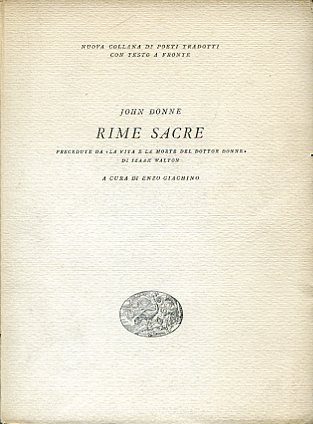 In-8°, pp. 120, brossura editoriale. Perfetto stato. Prima edizione della traduzione di Giachino delle poesie religiose del grande lirico metafisico inglese; testo originale a fronte. Precede la biografia di Donne scritta da Izaak Walton. Nuova collana di poeti tradotti con testo a fronte, 2.