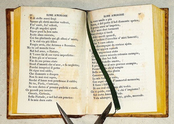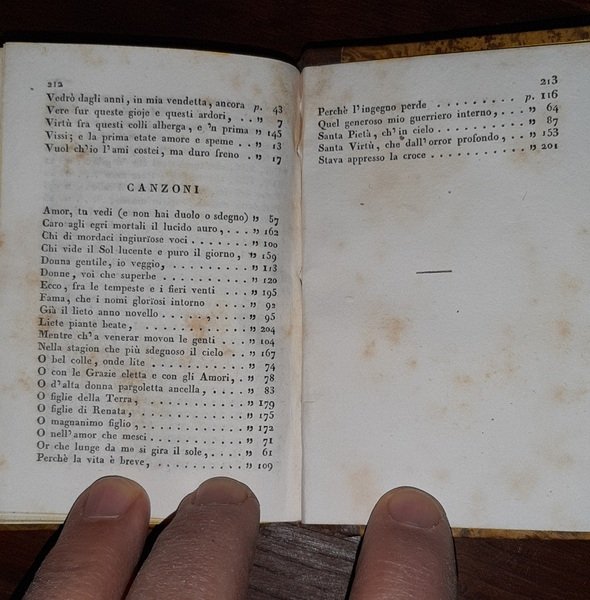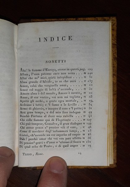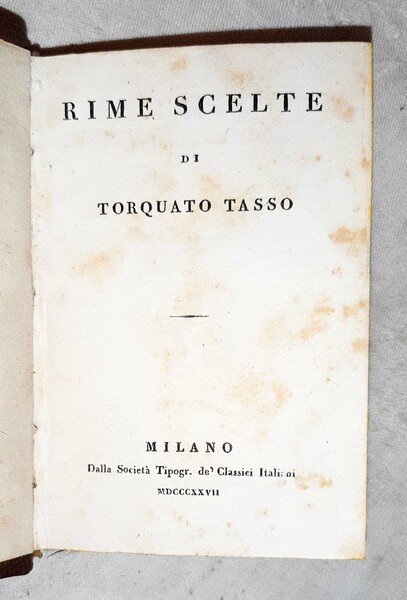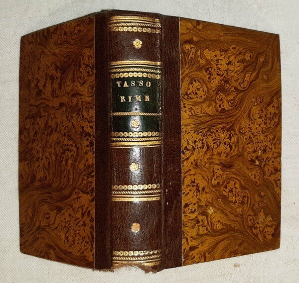 in-16°, 106x72 mm, leg. coeva in mezza pelle e carta marmorizzata, titolo e decori dorati su tassello al dorso, nastrino segnapagine, tagli gialli; pp. 213, [3]. Quinto volume, indipendente, dell'opera del Torquato Tasso, facente parte della collezione "Raccolta di poeti classici italiani antichi e moderni", n. 56. Rif.: IT\ICCU\LO1E\000256. Cond.: Tracce d'uso, mancanza di piccola porzione della cuffia inferiore; occasionali fioriture. Esemplare in condizioni generali molto buone.