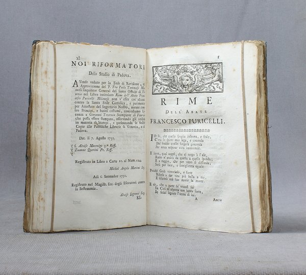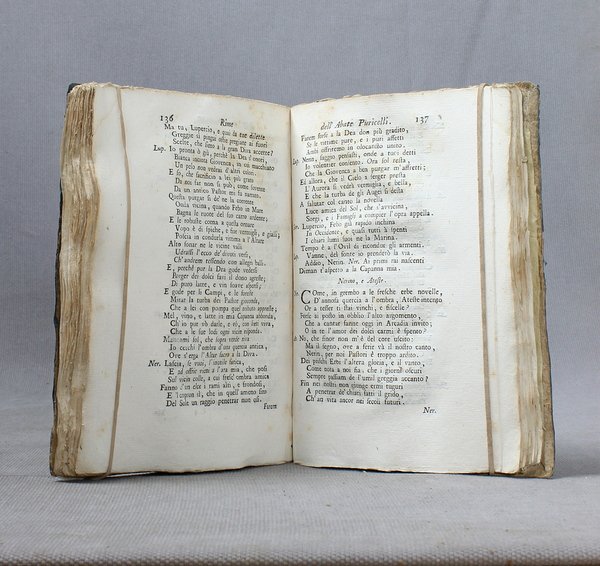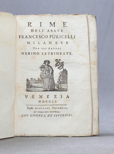 In-4ø; XL, 224 pp.; legatura del tempo in cartoncino muto (dorso rinforzato). Lieve alone al principio e qualche fioritura. Esemplare in barbe. Seconda edizione delle Rime del poeta milanese, curata dal Balestrieri. Precede una lettera di Gabriele Verri a Giuseppe Imbonati, una biografia del Puricelli, diversi sonetti di poeti arcadi milanesi. Tra le rime notevoli le cantate e gli intermezzi teatrali. Binda 3024.