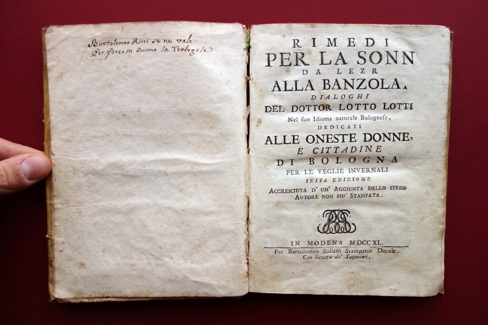 Rimedi per la Son da Lezr alla Banzola Lotto Lotti Bolognese Soliani Modena 1740