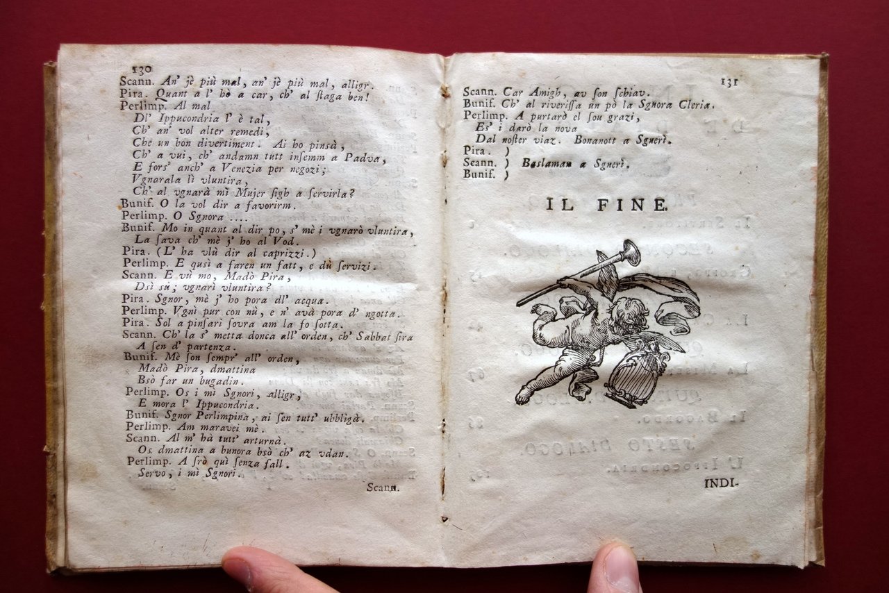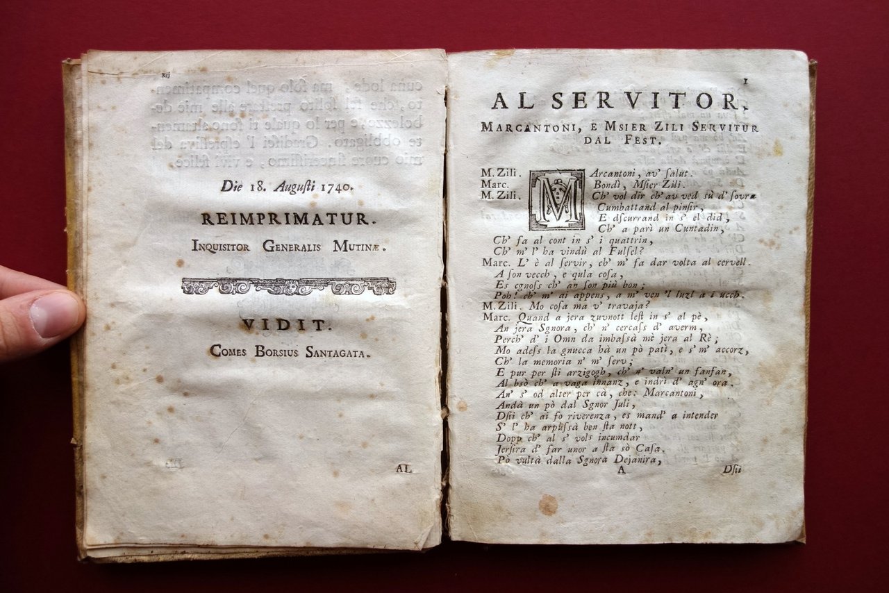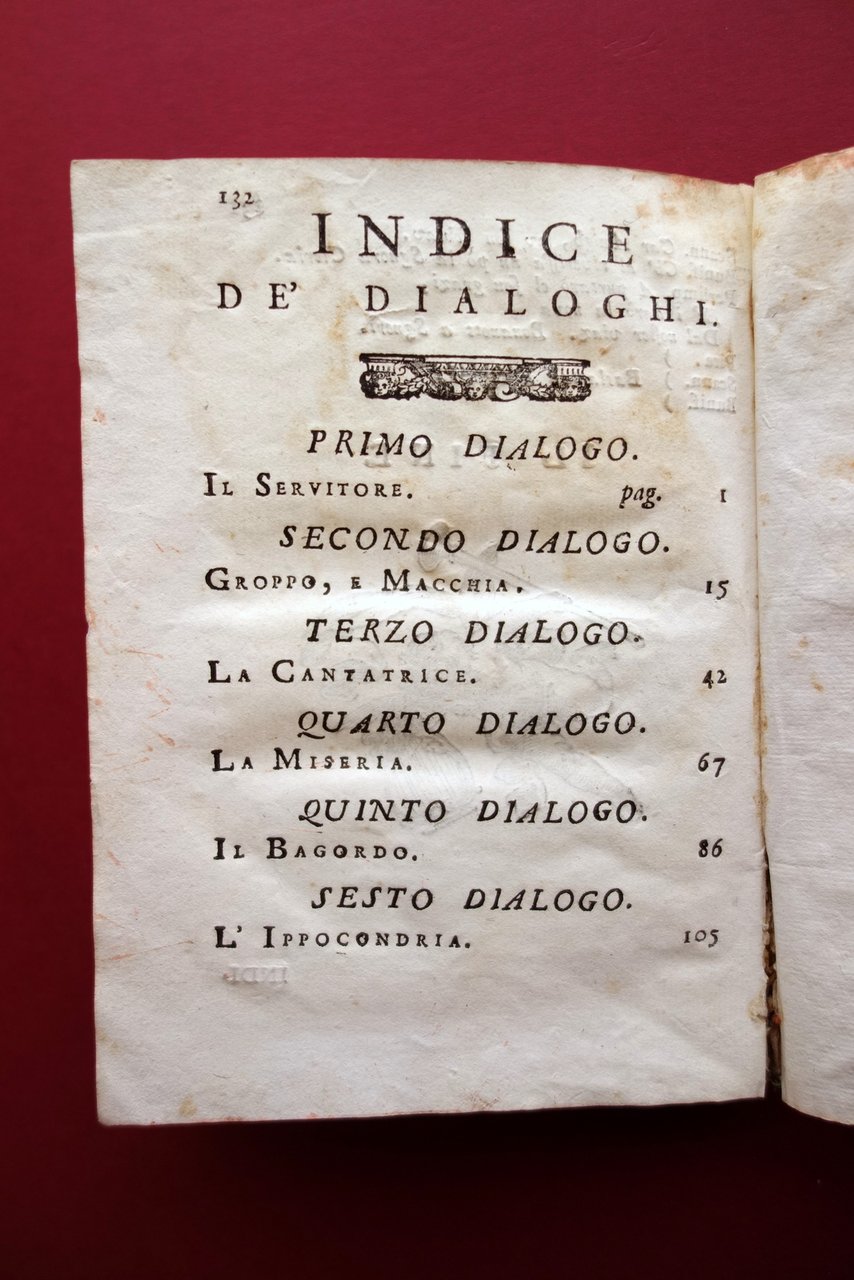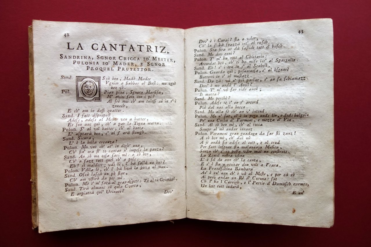 Settecentina, Rimedi per la son da lezr alla banzola dialoghi del dottor Lotto Lotti nel suo idioma bolognese dedicati alle oneste donne e cittadine di Bologna per le veglie invernali sesta edizione accresciuta d'un aggiunta dello stesso autore non pi√π stampata Bartolomeo Soliani, Modena 1740; cm 19x14; 1 c. b.; pp. XII-132; 1 c. b., con qualche capolettera e chiusure incise in b/n; legatura d'epoca in piena pergamena muta. Condizioni di conservazione Esemplare in buone condizioni con tracce d'uso e leggeri segni del tempo; piccole macchiette e aloni alla coperta; cerniera posteriore e margine esterno del piatto ant. con piccole mancanze. Interni buoni con alcune piccole leggere bruniture; margine esterno delle pp. 115-118 con un piccolo strappetto che non interessa il testo. Probabile mancanza dell'antiporta. Divertente e arguta opera in dialetto, che coglie aspetti comici della vita sociale bolognese del tempo (vedi, ad esempio, il terzo dialogo intitolato la cantatrice", in cui si ironizza sulla mania del canto). Edizione modenese del 1740, da ritenersi la pi√π completa. Probabilmente mancante dell'antiporta. SETT205.L19301 N "
