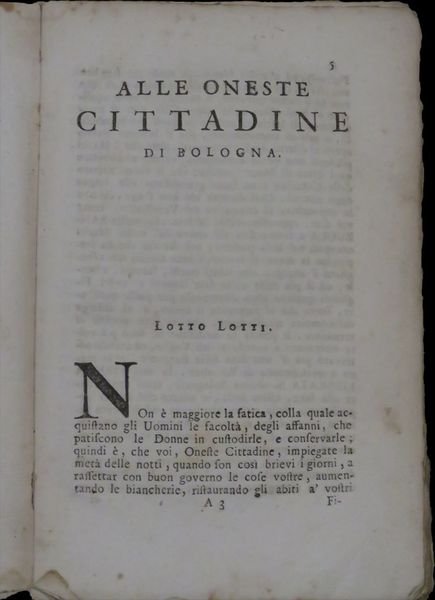 In 8°; 141, (3) pp. Legatura coeva in cartoncino molle. Primi due quaderni un po' lenti. Titolo manoscritto al piatto anteriore da mano ottocentesca. Antico timbretto di proprietà privata al frontespizio che attesta l'appartenenza del volume, prima all'avvocato Alfonso Magiera, membro dell'antica famiglia ebrea di origini polacche dei Magiera. All'inizio del volume è posto il noto capitolo a nome di Lotto Lotti "Alle Oneste Cittadine di Bologna". Luogo, stampatore ed anno si ricavano dal colophon. Qualche minima macchiolina di foxing in poche carte, un piccolo forellino al margine bianco interno della prima carta, assolutamente ininfluente e nel complesso, esemplare in buone condizioni di conservazione, ancora in barbe. Bell'antiporta realizzata da Giuseppe Cantarelli. Edizione fra le meno comune di questo celebre scritto dialettale bolognese composto dal noto poeta e cortigiano bolognese, Lotto Lotti (Bologna 1667 - ivi 1714). L'autore è noto per diversi componimenti poetici d'occasione e di 5 melodrammi. La sua opera fu estremamente innovativa. Il suo coniugare poesia, narrativa e teatro, rappresentò una svolta rispetto al teatro dialettale della Bologna tra il '600 ed il'700. Nella sua maturità, in particolare, a parte un celebre componimento per la liberazione di Vienna, scrisse poesie e componimenti dialettali dei quali i "Rimedi per la sonn da liezr alla Banzola" è il più celebre. In esso, scritto in un vernacolo bolognese colto equidistante dalla lingua del popolo e da quella di corte, l'autore ironizza e sbeffeggia usanze e tradizioni della Bologna dell'epoca. Il terzo dialogo dell'opera, La cantatriz, è forse il più celebre ed in esso, l'abitudine del canto durante gli incontri pubblici, anche da parte di chi tale dono non possiede, viene messo in ridicolo. L'opera è arricchita da una bella tavola che illustra una scena d'interni dove alcune donne sono alle prese con diversi mestieri. Rif. Bibl.: IT\ICCU\UBOE\027362.