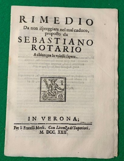 In 4°;11, (1) pp. Senza brossura ma ancora in barbe. Marca xilografica dello stampatore al frontespizio. Prima ed unica rara edizione di questo scritto polemico del noto medico veronese, Sebastiano Rotari (1667-1742) celebre per i suoi scritti polemici contro l'utilizzo del salasso per la cura dei malati e fautori dell'introduzione del mercurio per la cura di numerosissime malattie. L'opera si prefigge di ananlizzare il "mal caduco", epilessia, suggerendo alcuni rimedi, a detti del Rotari, sicuri. Esemplare in buone condizioni di conservazione ed ancora in barbe. Raro.