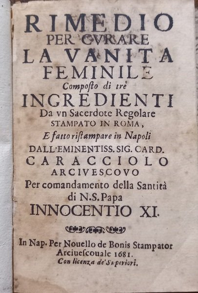 Rimedio per curare la Vanità Feminile composto di trè ingredienti da un Sacerdote Regolare. Stampato in Roma e fatto ristampare in Napoli dall’Eminentiss. Sig. Cardinale Caracciolo Arcivescovo. Napoli, Per Novello de Bonis, 1681.