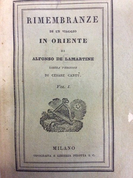 In-16 p. (mm. 161x 100), 4 volumi (primi 3 in bross. editoriale, il 4° in cartonato coevo, mm. 144x85), pp. (8),280; 315; 327; 253, con il ritratto di Lamartine inc. in rame al frontespizio del 1° vol. e 2 carte geografiche, pure inc. in rame e più volte ripieg., nel 4°volume. Con una breve introduzione ai lettori italiani di Cesare Cantù. Qualche lieve fiorit. interc. nel testo, altrimenti esemplare ben conservato.