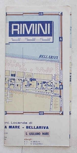 Pieghevole di 24 facciate di cm. 22 x 10; con, su un lato completamente aperto, pianta a più colori di Rimini con S.Giuliano a Mare e Bellariva con indicazione di tutti gli alberghi, pensioni e locande (circa 400); al verso piantine di Torre Pedrera, Viserbella e Viserba, Rivabella, Marebello e Rivazzurra, Miramare, sempre con indicazione delle strutture. VG.