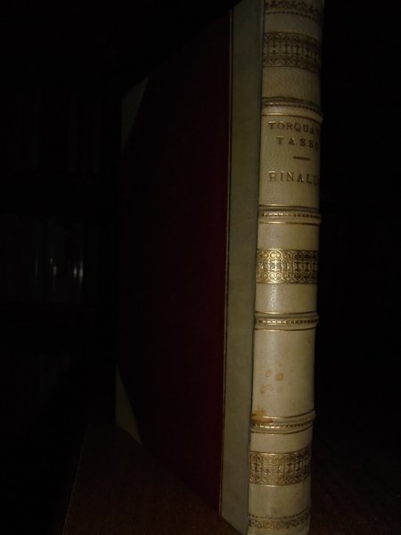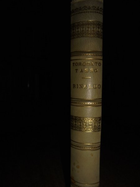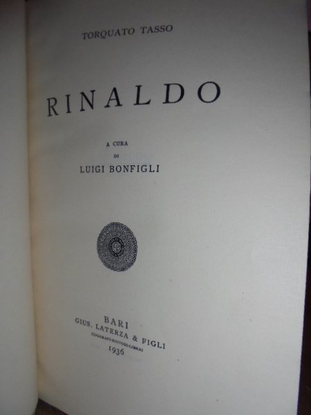 Torquato, Tasso. Bari, Gius. Laterza & Figli, 1936. Rinaldo. A cura di Luigi Bonfigli. In-8°, bella legatura in m. pergamena con angoli, dorso a 4 nervi con fregi e titolo in oro, taglio superiore dorato. 370, (1) pp. Bell' esemplare ad ampi margini con barbe al lato e sotto, segnalibro in seta rossa. Neg. mob. 14 sotto