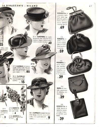 Catalogo mensile (cm 32x24,5) pag. 12 tutte illustrate --Soprabiti, costumi a due capi, cappelli, borsette, guanti, calze, tutto con i relativi prezzi