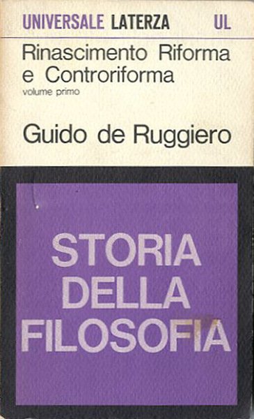 8. ed. 2 v. (510 p.) ; 18 x 11 cm. Universale Laterza. Il volume, il terzo della imponente «Storia della filosofia» di de Ruggiero, con somma sapienza descrive la genesi e lo sviluppo della riflessione filosofica nel 14. e 15 secolo. . Brossura editoriale, coperta illustrata a colori in cartoncino flessibile con titolo impresso in nero al piatto e al dorso. Qualche lieve segno del tempo alla coperta, al dorso e al taglio (ingiallimento) per il resto buon esemplare. Sottolineature a matita in alcune pagine interne ma nel complesso buon esemplare. Nel front. firma ms. di appartenenza. Codice libreria 3255.