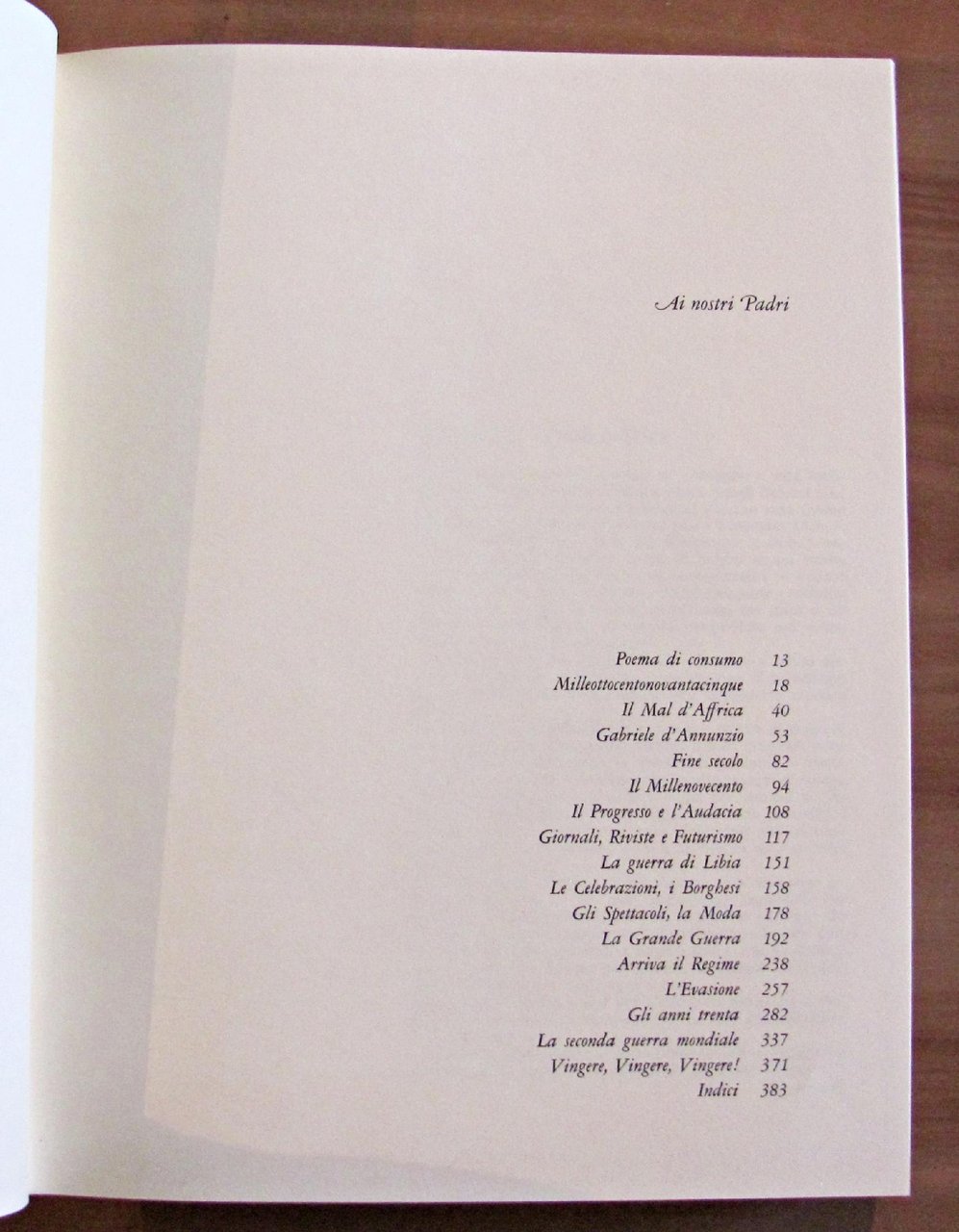Moltissime illustrazioni n.t. e f.t. in b/n e a colori che meglio rappresentano il vissuto di questo mezzo secolo di vita italiana attraverso foto, disegni, riviste, pubblicità, cartoline... Ed. Giorgio De Fonseca - Roma, 1975. Tela editoriale inserita in custodia telata originale. Fascetta editoriale conservata all'interno, ripiegata. 25x33; pp.376. OTTIMO STATO , Ottimo (Fine)