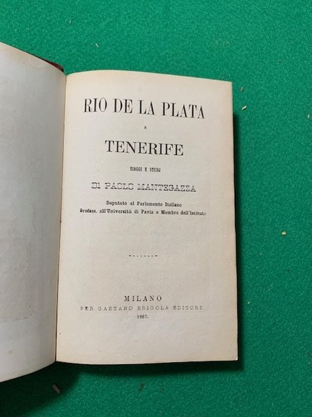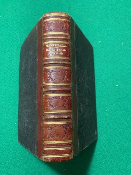 In 8°; 731 (ma 734) pp. e 9 c. di tav. delle quali una doppia e una più volte ripiegata. Bellissima legatura coeva in mezza-pelle rossa. Dorso a 4 nervi. Autore, titolo, filetti in oro e fregi a secco ai tasselli ed ai nervi. Piatti foderati in tela. Prima edizione in ottime condizioni di conservazione di questa importante opera dedicata a Rio de La Plata e Tenerife scritta dal celebre fisiologo, patologo, igienista, neurologo, antropologo e scrittore italiano, Paolo Mantegazza (Monza, 31 ottobre 1831 - San Terenzo, 28 agosto 1910) fra i primissimi divulgatori delle teorie darwiniane in Italia e fra i primi antropologi moderni. "Subito dopo la laurea, spinto dal desiderio di avviare imprese economiche e probabilmente anche per motivi sentimentali, il M. lasciò l'Italia: dopo essere passato per la Francia, la Germania e l'Inghilterra, si recò in Argentina, in Paraguay, in Bolivia, ove compì numerose osservazioni naturalistiche, botaniche, etniche ed etnoiatriche. Nel 1856 a Salta, in Argentina, conobbe e sposò Jacobina Tejada Montemajor, dalla quale l'anno successivo ebbe il suo primo figlio. Intrapreso nel 1858 il viaggio di ritorno in Italia, la lunga sosta alla quale, per motivi sanitari, fu costretto a Tenerife gli offrì l'opportunità di dedicarsi allo studio antropologico e craniomorfologico delle popolazioni locali. Frutto dell'esperienza maturata in questi viaggi furono i due volumi Sulla America meridionale; lettere mediche, editi a Milano nel 1858-60, e i lavori: Sulle virtù igieniche e medicinali della coca e sugli alimenti, in Annali universali di medicina, s. 4, XXI (1859), 501, pp. 449-519, al quale nel 1858 era stato conferito il premio Dell'Acqua dell'ospedale Maggiore di Milano; Degli alimenti nervosi narcotici, in L'Igea, III (1864), pp. 354 s.; Sull'uso terapeutico della coca, ibid., V (1866), p. 284; Rio de La Plata e Tenerife: viaggi e studi, Milano 1867." da Treccani.