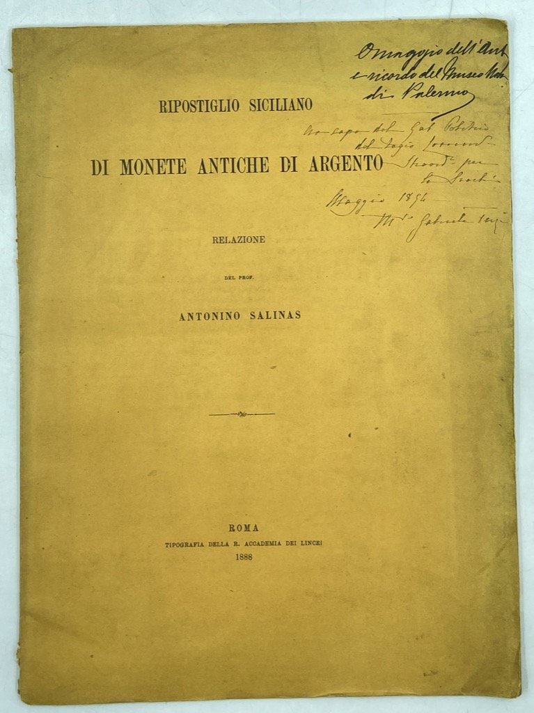 Brossura editoriale a stampa, in quarto cm 30 x 22, pp 20 più tre tavole impresse su carta forte dalla Fototipia Danesi, con 37 monete riprodotte. Lievi segni d'uso sulla brossura, annotazione sul piatto anteriore, lievi fioriture sulle tavole. Memoria, estratta dalle Notizie degli scavi di Maggio 1888, dell’illustre archeologo siciliano Antonio Salinas, relativo a monete reperite in uno scavo nella parte occidentale dell’isola. Sulla brossura presente una nota manoscritta accompagnata dall’invio autografo «Omaggio dell’Aut. E ricordo del Museo Naz. di Palermo», del quale Salinas era direttore dal 1873.