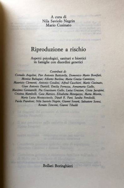 Soggetti: Famiglia, Relazioni, Medicina, Bioetica, Procreazione assistita, Psichiatria, Psicologia medica, Fertilità, Infertilità, Fecondazione artificiale, Gravidanza, Parto, Puericultura, Malattie congenite, Clinica, Salute, Sociologia, Filosofia, Biologia, Genetica, Counseling psicologico, Ereditarietà, Diagnosi, Difetti genetici, Rischio, Test predittivi, Malattia di Huntington, Malta, Stati Uniti, Distrofia muscolare, Duchenne, Steinert, Distrofia miotonica, Figli, Parent Training, Sindrome di Turner, Genitori, Madri, Padri, Genoma umano, Leggi, DNA, Bibliografia, Libri fuori catalogo, Corrado Angelini, Alfred Cuschieri, Portatori sani, Coppie, Prognosi, Prevenzione, Anomalie del feto, Family, Relationships, Medicine, Bioethics, Assisted reproduction, Psychiatry, Medical psychology, Fertility, Infertility, Artificial fertilization, Pregnancy, Childbirth, Childcare, Congenital diseases, Clinic, Health, Sociology, Philosophy, Biology, Genetics, Heredity, Diagnosis, Genetic defects, Risk, Predictive tests, Huntington's disease, United States, Muscular dystrophy, Myotonic dystrophy, Children, Syndrome, Parents, Mothers, Fathers, Human genome, Read, Bibliography, Out of print books, Healthy carriers, Couples, Prognosis, Prevention, Anomalies of the fetus