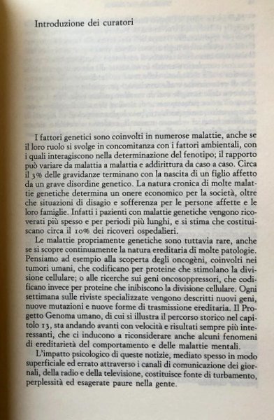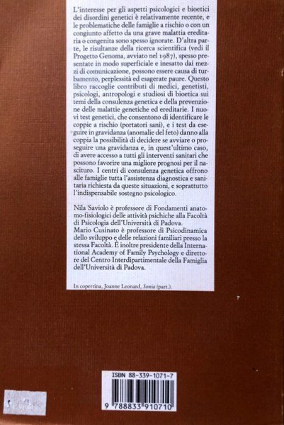 L'interesse per gli aspetti psicologici e bioetici dei disordini genetici è relativamente recente, e le problematiche delle famiglie a rischio o con un congiunto affetto da una grave malattia ereditaria o congenita sono spesso ignorate. D'altra parte, le risultanze della ricerca scientifica, spesso presentate in modo superficiale e inesatto dai mezzi di comunicazione, possono essere causa di turbamento, perplessità, ed esagerate paure. Questo libro raccoglie contributi di medici, genetisti, psicologi, antropologi e studiosi di bioetica sui temi della consulenza genetica e della prevenzione delle malattie genetiche ed ereditarie, e viene incontro all'esigenza di fornire informazioni alle famiglie interessate.