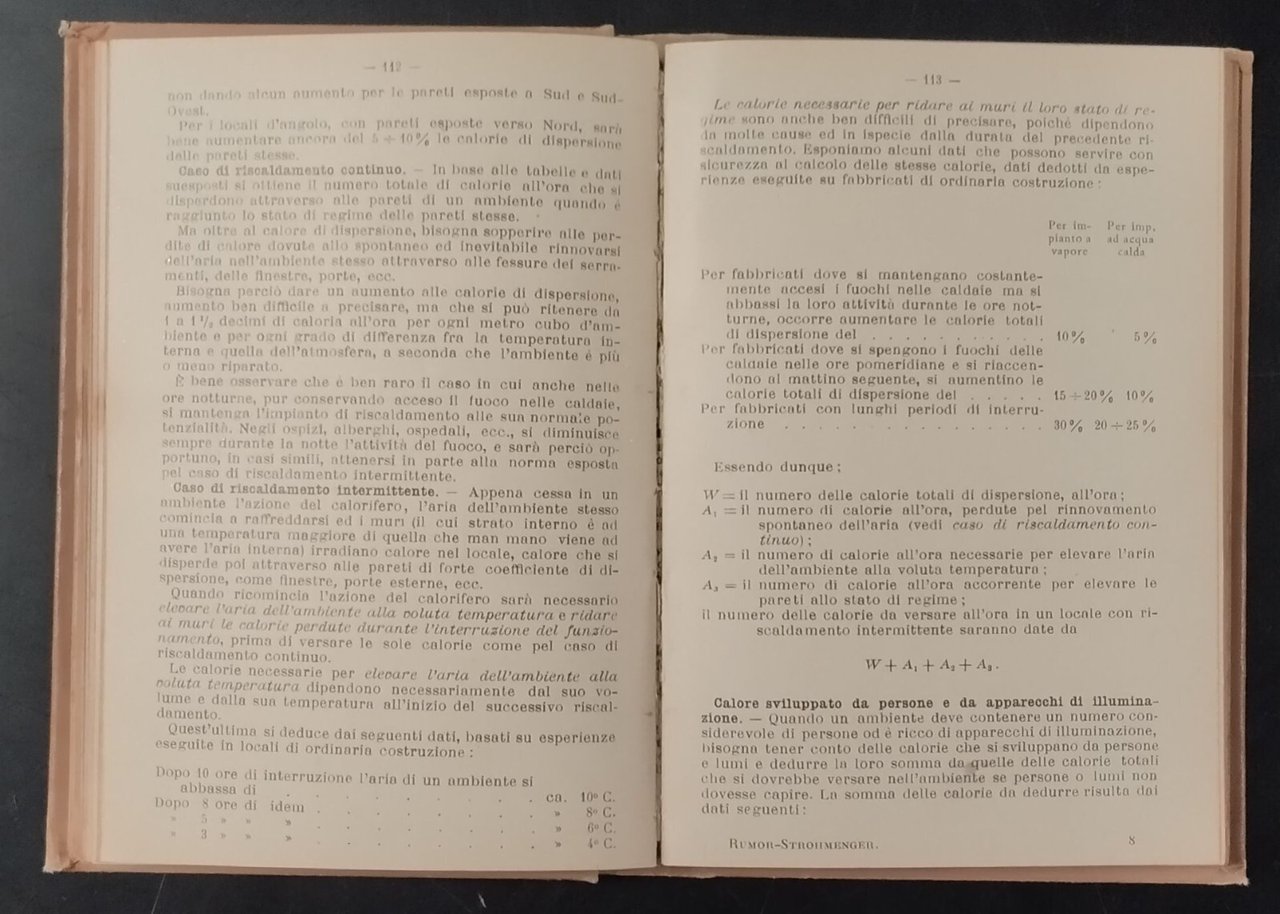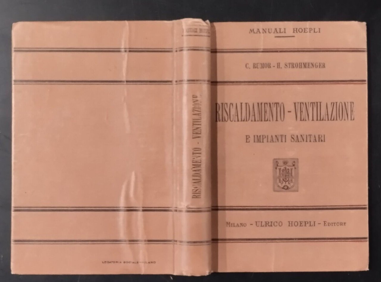 RISCALDAMENTO VENTILAZIONE E IMPIANTI SANITARI di C. Rumor e H. Strohmenger. Hoepli Editore, 1911 . XVI, 270 + 64 pagine, numerose figure in bianco e nero nel testo. Copertina editoriale in tutta tela. Stato di conservazione: molto buono (pagine normalmente ingiallite) Libro usato saggistica manuale ingegneria