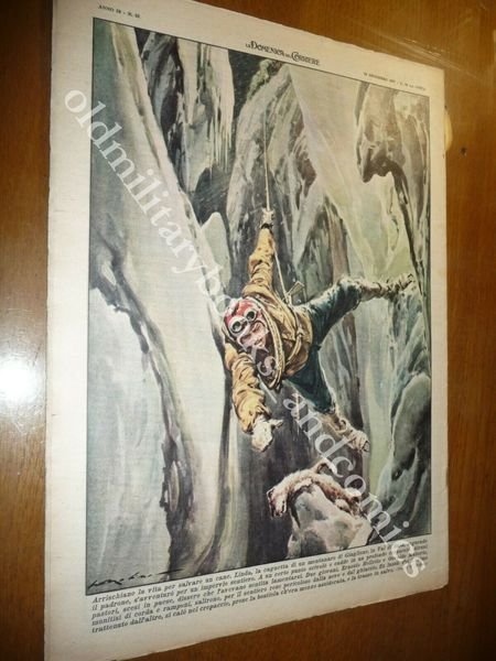 DESCRIZIONE: Domenica del Corriere, Milano, Anno 57 n. 52 (29 DICEMBRE 1957). COPERTINA: Rischiano la vita per salvare un cane. Linda la cagnetta di un montanaro di Giaglione in Val di Susa scivolò e cadde in un pendio. Due giovani Ernesto BELLETTO e Osvaldo MABERTO si prodigarono per il salvataggio. RETRO: Conferenza della NATO a Parigi La Domenica del Corriere è stato un popolare settimanale italiano fondato a Milano nel 1899 e chiuso nel 1989. Apparve per la prima volta nelle edicole l'8 gennaio 1899 come supplemento illustrato del Corriere della Sera. Stampata in grande formato (sul modello del domenicale La Tribuna illustrata), aveva 12 pagine e veniva distribuita gratis agli abbonati del Corriere, oppure si poteva acquistare in edicola per 10 centesimi. La prima e ultima di copertina erano sempre disegnate. Il Corriere si avvaleva di un giovane disegnatore, Achille Beltrame, allora sconosciuto, a cui veniva affidato in ogni numero il compito di rendere con la sua tavola il fatto più interessante della settimana. Dopo la sua morte nel 1945, fu sostituito da Walter Molino che, come il suo predecessore, firmò memorabili copertine. A differenza dei settimanali dell'epoca, la Domenica del Corriere diede ampio spazio alle fotografie e ai disegni, e questo fu uno dei motivi del suo successo. CONDIZIONI: Discrete/Buone rivista senza azzurrina scotch in copertina PESO / WEIGHT: 200 gr. without package