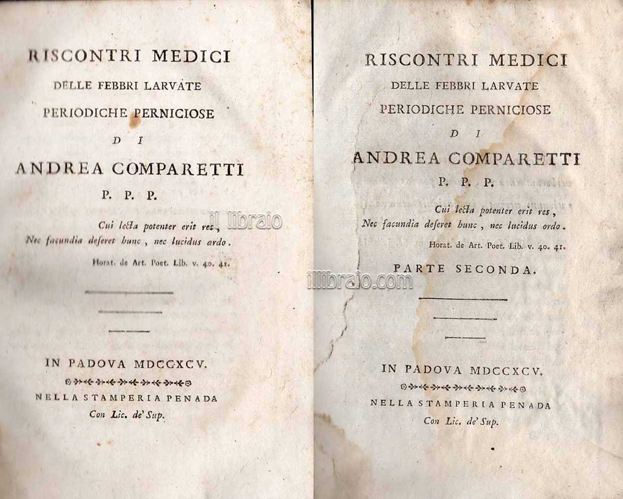 2 voll.; in 8°; pp. LXXXVIII, 736 compl.; leg. in mezza pelle con titoli e fregi in oro ai dorsi; fregio al colophon; 1^ ed. Rara opera che rese celebre Andrea Comparetti (Vicinale di Buttrio-Udine 1745-Padova 1801), famoso medico ed insegnante dell'universita patavina, morto della stessa malattia che studiò con tanta attenzione. Una sua lapide sepolcrale sta nella chiesa di S. Sofia in Padova. -. con il Comparetti a Padova la clinica migliorò nettamente i suoi standards: egli impostò programmi individuali per ogni paziente, con schede in cui, alla storia medica personale, si univano dati sulle terapie praticate, l'alimentazione e le connessioni climatiche dello stato morboso, prefigurando l'analisi chimica delle secrezioni e dell'aria degli ambienti dell'ospedale; propose anche che per l'esercizio della medicina fosse richiesto un triennio di pratica ospedaliera dopo il quadriennio di laurea. A queste posizioni evolute nella prassi clinica corrisponde il maggior pregio degli scritti medici, e particolarmente del più noto, i "Riscontri medici delle febbri larvate periodiche perniciose". - (cfr. Dizionario Biografico Treccani)