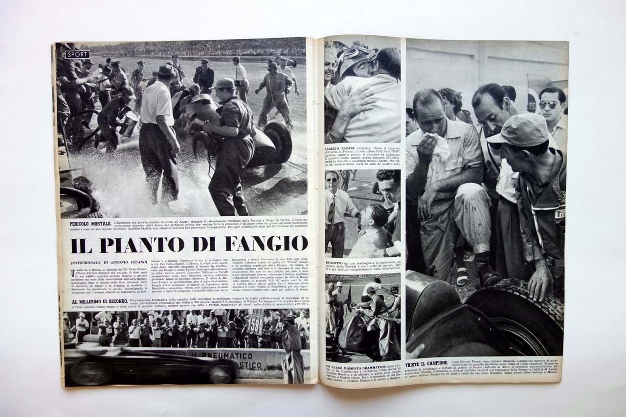 Rivista, Il pianto di Fangio" e "il riso di Ascari" retro di copertina e articolo illustrato di due pagine in "Tempo" anno XIII - numero 39 Milano, 29 settembre 1951 Ed. Milano Nuova, Milano 1951; cm 34,5x26; pp. 40 con numerose ill. fotografiche in b/n; copertina ill. a colori (esemplare a fogli sciolti). Numero completo. Cm 34,5x25,5. Condizioni di conservazione Buone condizioni con tracce d'uso, a fogli sciolti, con minimi marginali accenni di ingiallimento dovuti al tipo di carta. Interni buoni. L'articolo è alle pagine 32-33. Numero completo. SC03.D18457 N F "