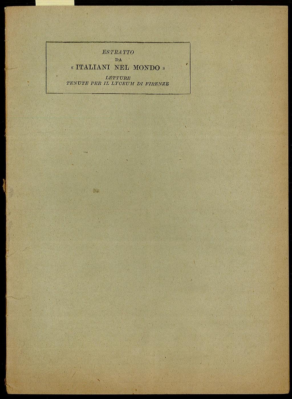 Opuscolo vintage. Estratto da “Italiani nel mondo” letture tenute per il Lyceum di Firenze. Strappetti sul dorso. Segno del tempo.