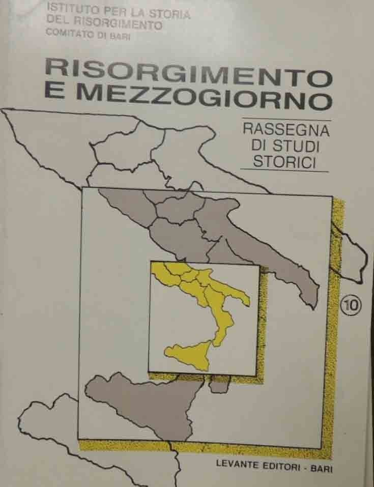 Risorgimento e Mezzogiorno. Rassegna di studi storici, anno V, n. 2, dicembre 1994, Levante Editori, Bari 1994, pp. 120, cm 24, br. ed. In testa alla prima di copertina: Istituto per la Storia del Risorgimento – Comitato di Bari. Alla prima di copertina: n. 10. Indice: M. fantasia, Giovanni Spadolini o dell’Unitarismo – R. Colapietra, La deputazione di Lucera dall’Unità al fascismo – G. Liberati, Alfonso Perrella e la storia dei demani meridionali – A. Scirocco, Il collegio di Bari all’inizio dell’Ottocento – M. Padovano, Comitati di bari e provincia per la sottoscrizione di spada d’onore e sussidi per la guerra del generale Garibaldi – V. Melchiorre, Alcuni documenti dell’archivio di S. Nicola di Bari sulla terza guerra d’indipendenza – L. Munafò, Il contributo della Puglia nella guerra di liberazione – C. De Luca, Un chirurgo napoletano di origine pugliese precursore della Croce Rossa: Ferdinando Palasciano – Recensioni - Notiziario – Tesseramento – Attività 1995 – Amici scomparsi. Perfetto.