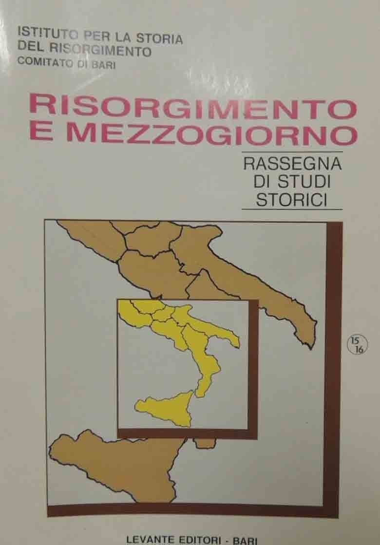 Risorgimento e Mezzogiorno. Rassegna di studi storici, anno VIII, n. 1-2, dicembre 1997, Levante Editori, Bari 1997, pp. 256, cm 24, br. ed. In testa alla prima di copertina: Istituto per la Storia del Risorgimento – Comitato di Bari. Alla prima di copertina: n. 15-16. Indice: G. d. G., Editoriale – R. Giura Longo, Le ragioni di un convegno – G. de Gennaro, L’età francese in Terra di Bari dal diario inedito del Sottintendente di Barletta don Antonio de Leone –L. Palumbo, Terra d’Otranto di fine Settecento nelle corrispondenza di ecclesiastici e baroni – V. Zacchino, Liborio Romano, Oronzo Gabriele Costa, Antonio Winspeare – A. Anzoino, Un intellettuale tarantino tra Illuminismo e Restaurazione: Giovambattista Gagliardo – S. Miccolis, Antonio Labriola e la Destra storica – A. Rovito, Cosenza a metà Settecento – D. Di Nuovo, Alcuni aspetti del meridionalismo economico di Giovanni Carano Donvito – P. Finelli, Alleanze politiche e reti notabiliari nell’Ottocento meridionale: la prima elezione di Giovanni Bovio – L. Carcerieri, R. Martucci, F. Quarto, Individualità nella storia. Significati e tendenze della ricerca storica pugliese nella seconda metà dell’Ottocento – E. Inguscio, Attività amministrativa e disagio sociale a Ruffano del 1880 al 1900 – T. Del Conte, L’industria della carta nel Mezzogiorno preunitario – V. Bosna, assistenza, istruzione previdenza a favore delle ragazze orfane, povere o abbandonate tra XVIII e XIX secolo – S. Cammarota, Sigismondo Castromediano e la scrittura carceraria del Risorgimento – G. de Gennaro, Le giornate di studio su Bisceglie e Terra di Bari in età moderna – R. Giura Longo, La complessità di Salandra e la tradizione liberale meridionale – G. Claps, Tommaso Claps un galantuomo nela cultura del Novecento – L. Masella, Franco De Felice, storico del Novecento – V. A. Leuzzi, Giuseppe Papalia tra impegno giuridico e attività politica – Notiziario – Recensioni. Perfetto.