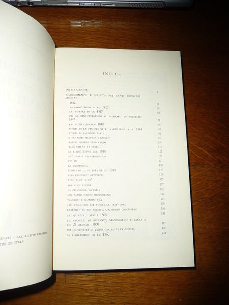 DESCRIZIONE: Parenti Ed. Firenze 1961 in 8° pp. 8+350 con 25 tavv. f.t. di cui 9 a colori, leg. t. tela edit. con tit. in oro al dorso, sovracc. fig. a colori?. Elenco delle canzoni riportate in foto a fine inserzione. Importante studio sulle tradizioni popolari siciliane a latere dalle forme tradizionali di storiografia ufficiale. CONDIZIONI DELL'OGGETTO: Ottime, lievi segni del tempo, in specie alla sovracc. PESO/WEIGHT: 600 g without package